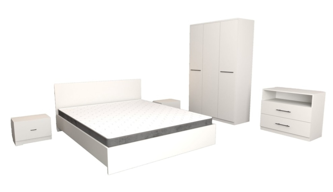 Pat: 160 x 200 cm Dulap 3 usi cu rafturi si bara haine: 120 x 47 x 200 cm Comoda 2 sertare si spatiu depozitare : 83 X 42 X 71 cm Noptiere 2 buc : 44 X 32 X 23cm