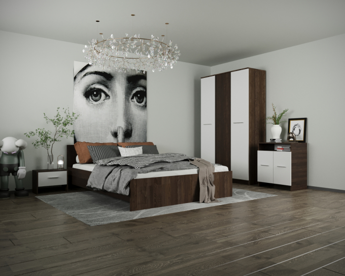 Pat: 160 x 200 cm Dulap 3 usi ,rafturi si bara haine: 120 x 47 x 200 cm Comoda 2 usi si spatiu depozitare :63 X 72 X 42cm Noptiere 2 buc : 48 X 32 X 22 cm