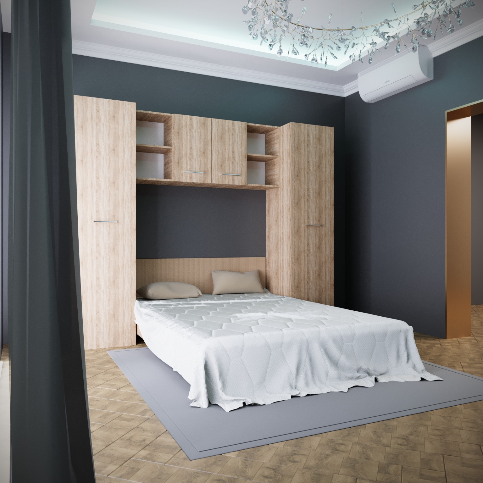 Pat: 145 x 205 cm Soldat cu bara :50x49x200 cm soldat cu rafturi :50x49x200 cm Vitrina 147x30x63 cm Dimensiuni pentru saltea 140x200 Salteaua nu este inclusa Dormitorul este unul dintre cele mai importante incaperi din locuinta ta, ( nu contine saltea, lenjerie sau obiecte de decor) |