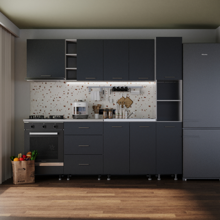 Daca spatiul tau se rezuma la 240cm si esti un iubitor al culorii Antracit, noi iti recomandam mobila de bucatarie Sena!