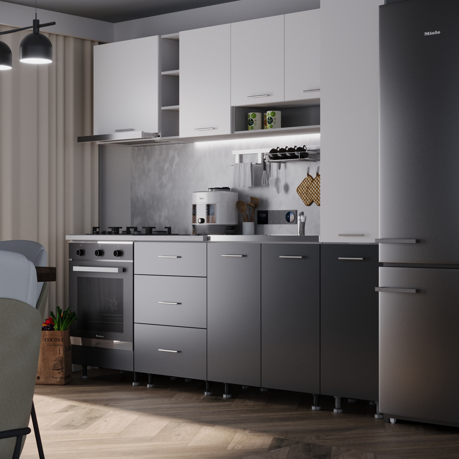 Daca spatiul tau se rezuma la 240cm si esti un iubitor al culorii Antracit&Alb, noi iti recomandam mobila de bucatarie Sena!
