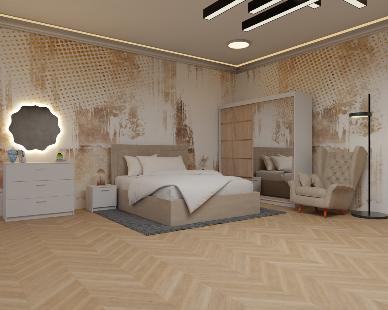 Dormitor Lotus Pat Tapitat Dressing 200x200 Alb cu oglinda