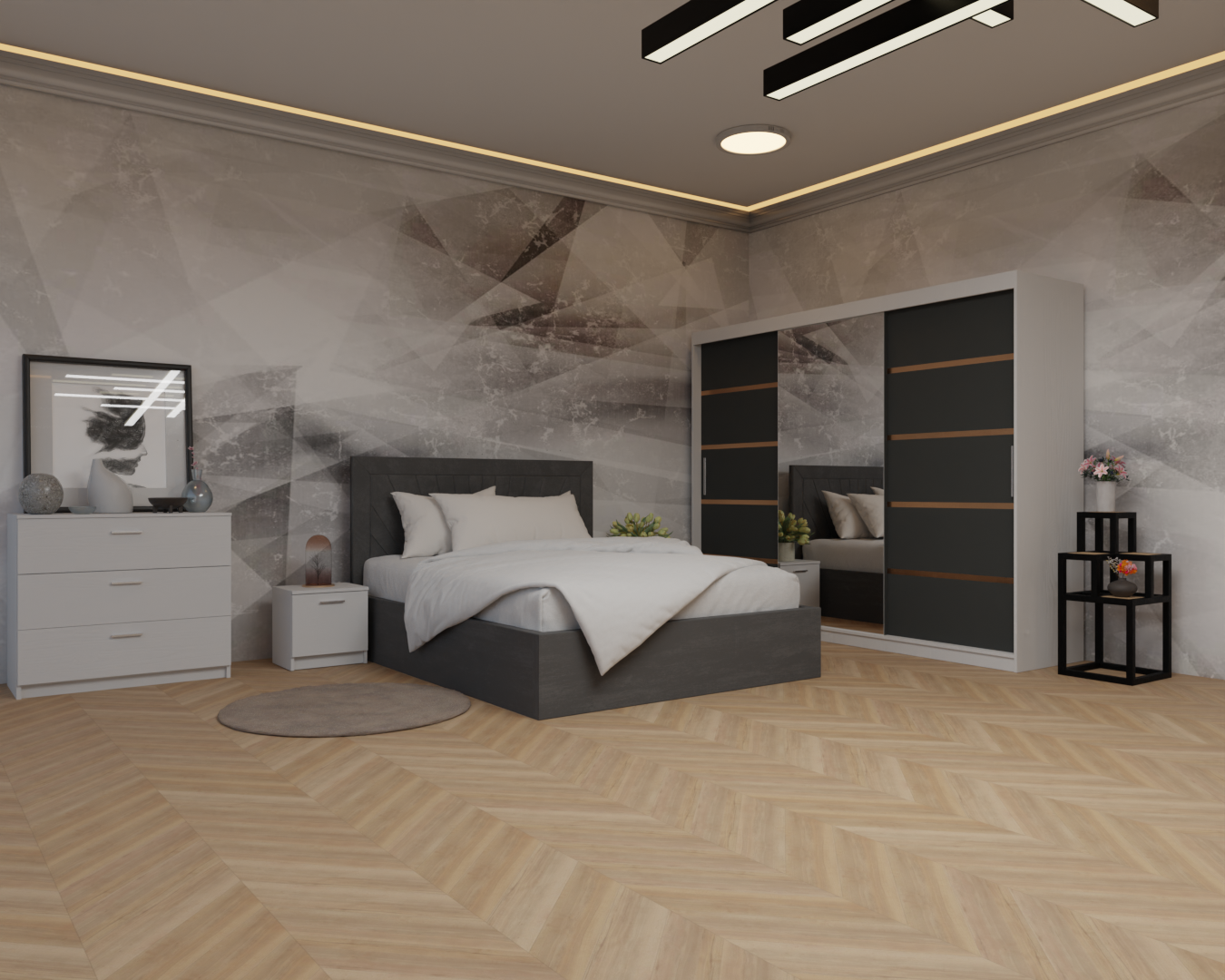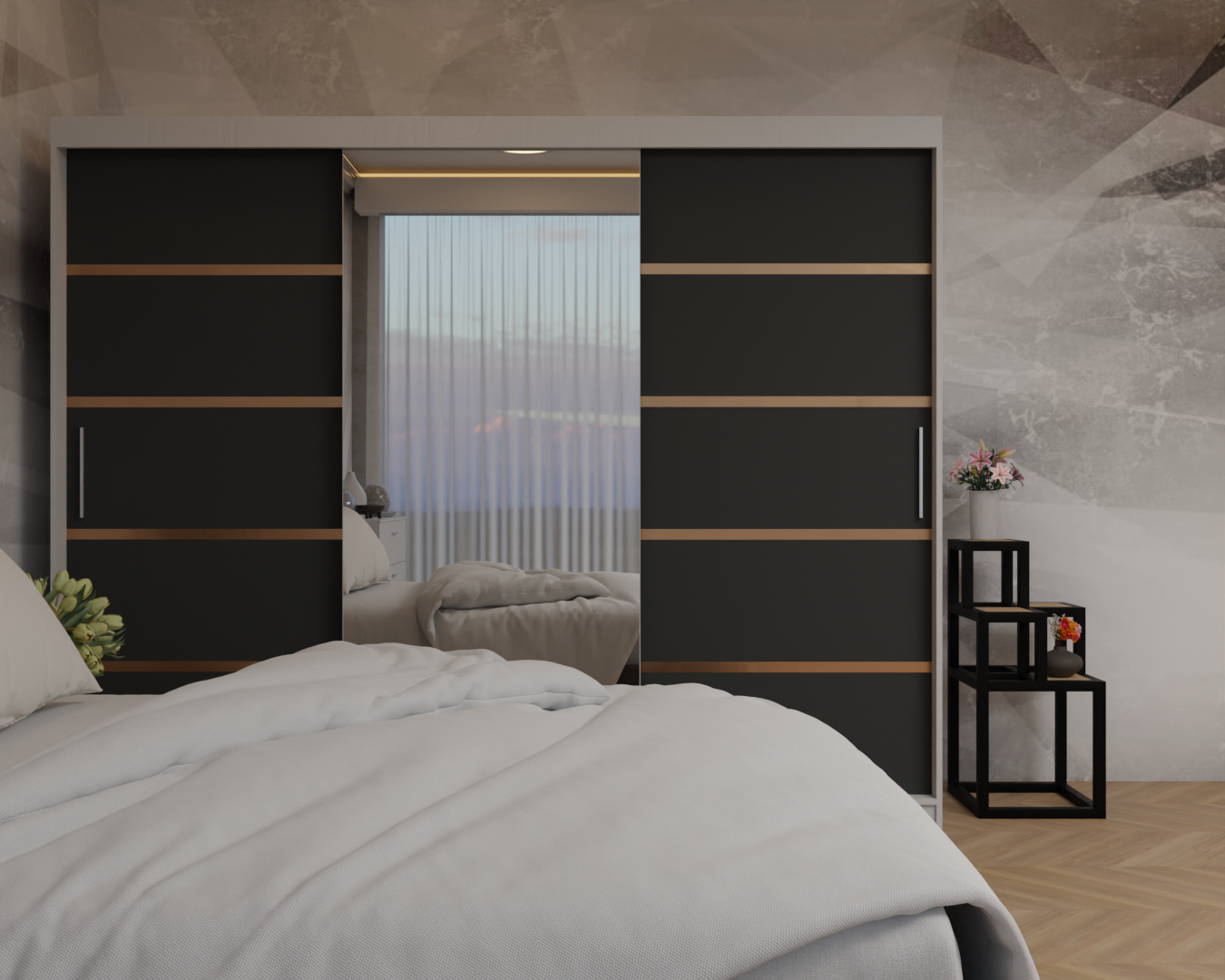 Dormitor: Lotus Pat Tapitat Dressing 250x200 Alb&Antracit 3 Usi cu Oglinda