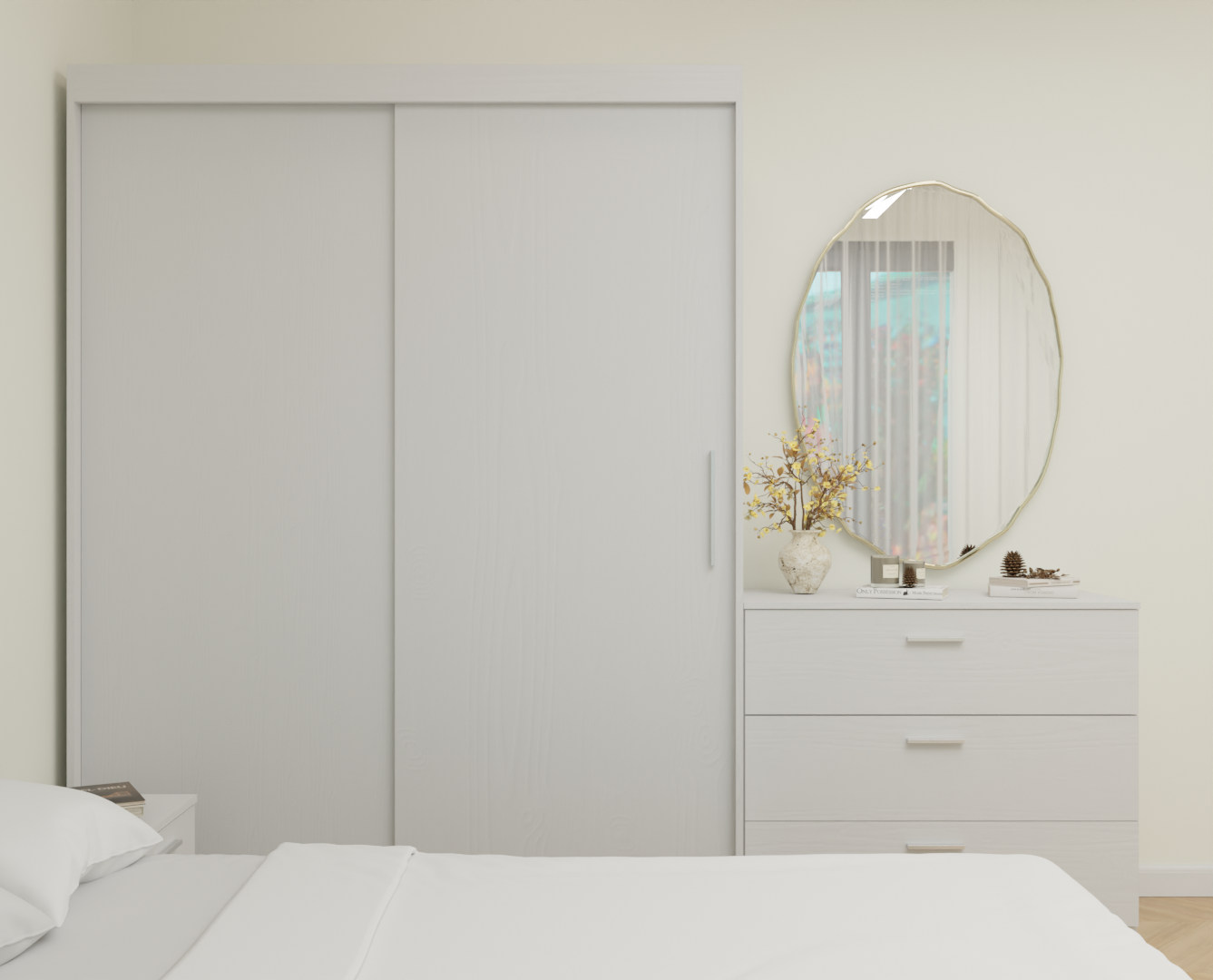 Dormitor MILANO cu Pat Tapitat Stofa cu dulap usi glisante Alb , noptiere si comoda
