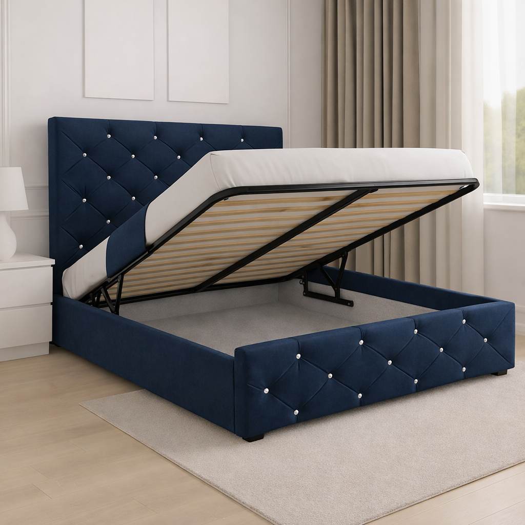 Tapițeria din stofă oferă un aspect plăcut și o senzație de confort, fiind ușor de integrat în diferite stiluri de amenajare. Structura solidă din PAL asigură rezistență și stabilitate, iar somiera rabatabila oferă un suport sigur și durabil pentru saltea, cat si spatiu de depozitare.