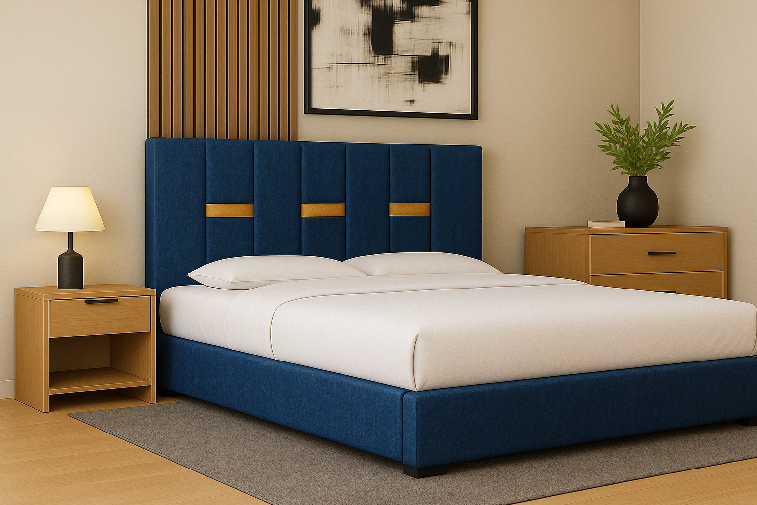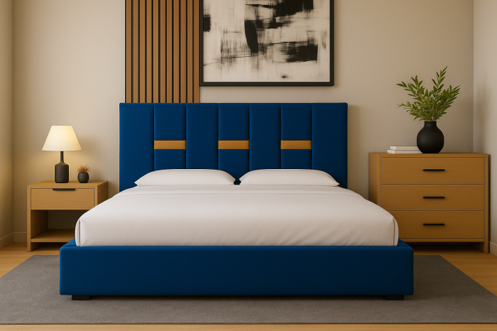 Un pat modern, tapițat în stofă elegantă, cu tăblie înaltă și detalii verticale decorative. Oferă confort, stabilitate și un design rafinat, perfect pentru a crea un dormitor cald și stilat.
