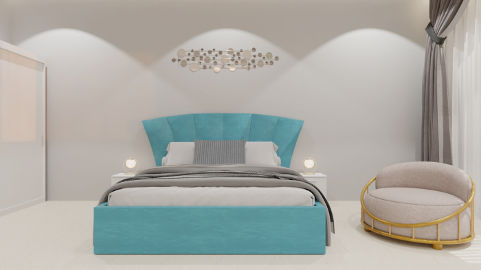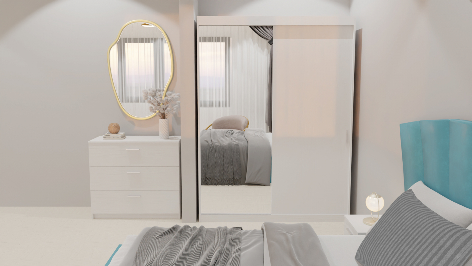 Dormitor Lucas Tapitat Turcoaz 2 Usi Alb cu Oglinda