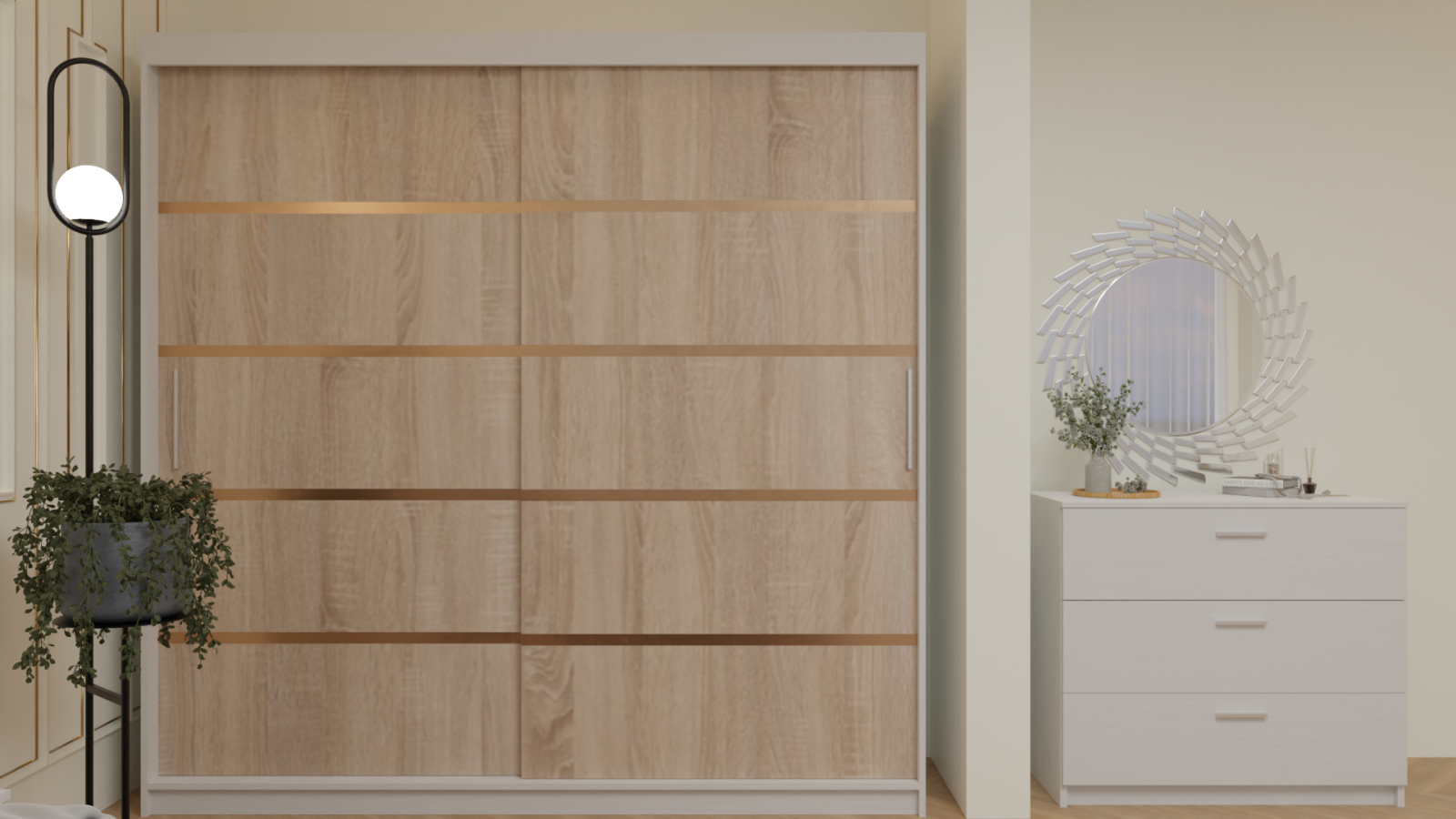 Dormitor Cairo cu Pat Tapitat cu dressing 200*200 usi glisante Alb&Sonoma , noptiere si comoda