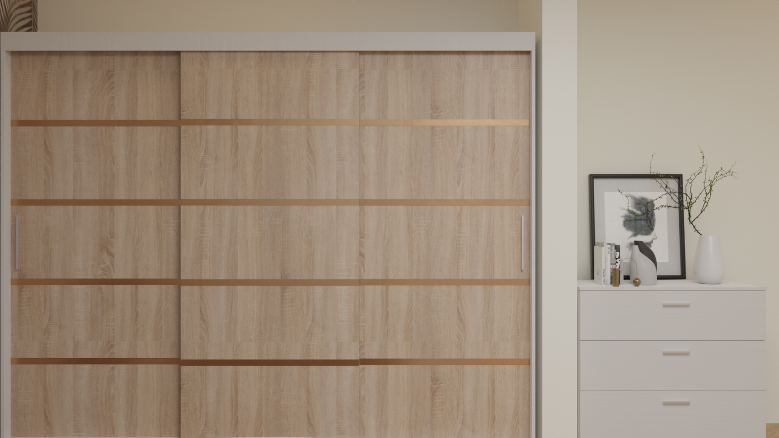 Dormitor Cairo cu Pat Tapitat cu dressing 250*200, 3 usi glisante Alb&Sonoma, noptiere si comoda