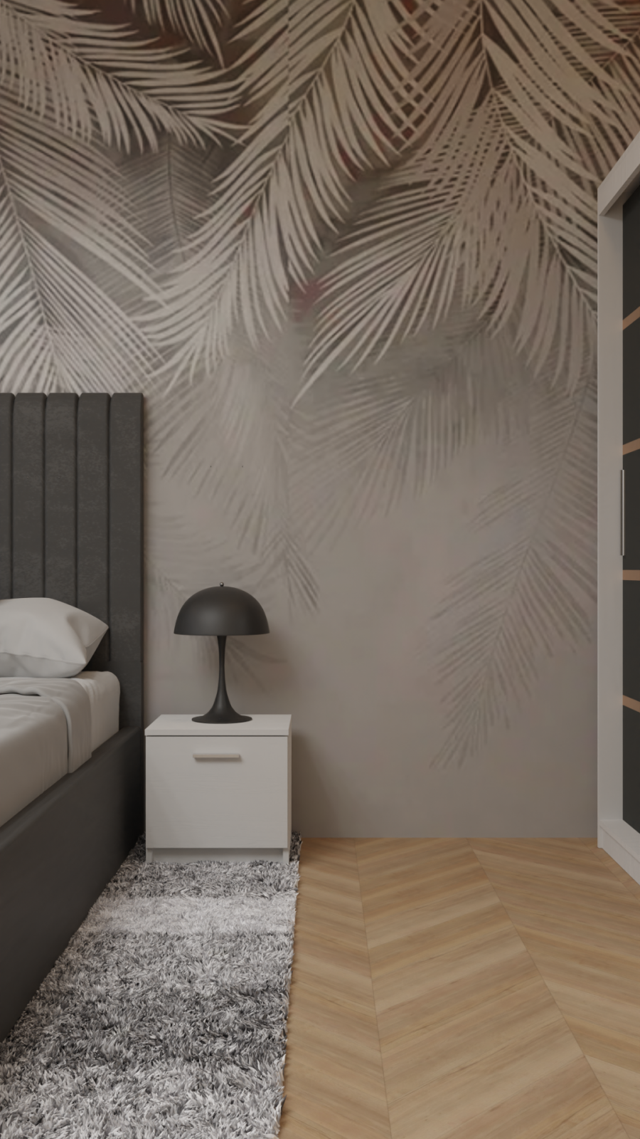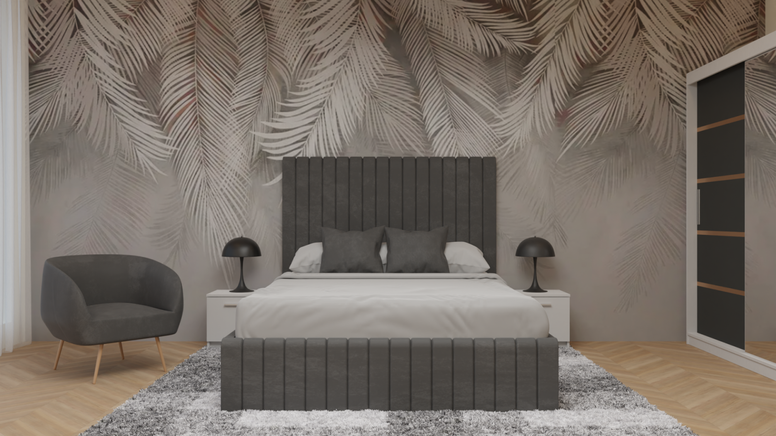 Dormitor Cairo cu Pat Tapitat cu dressing 250*200, 3 usi glisante Alb&Gri Antracit cu Oglinda, noptiere si comoda