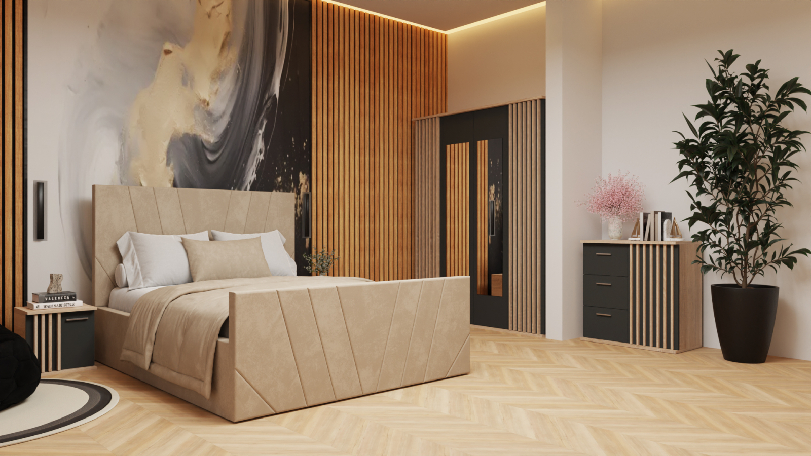 Dormitor: Dallas Cu Pat Tapitat Bej