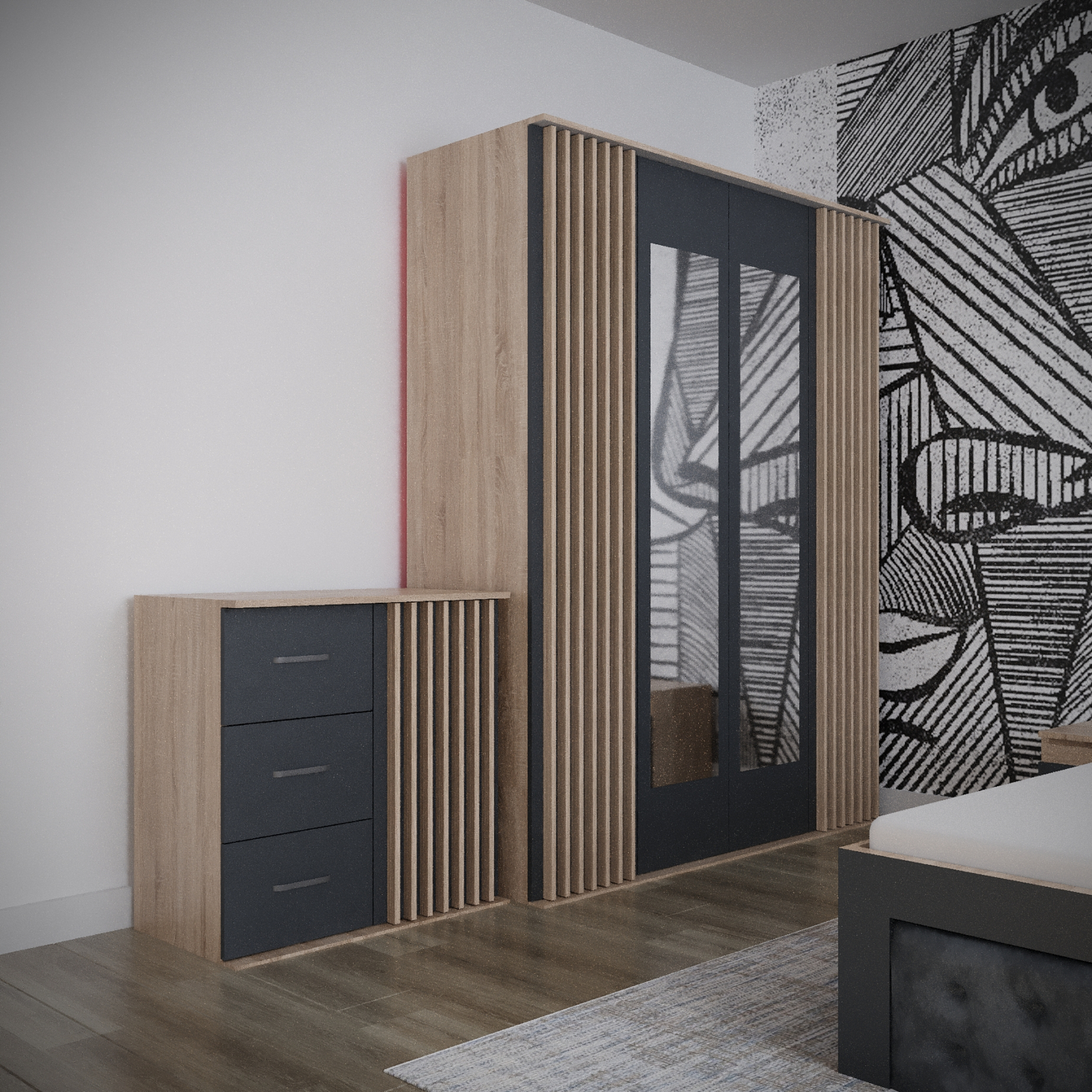 Ansamblul este realizat din PAL de 16mm, cant PVC si manere plastic.
