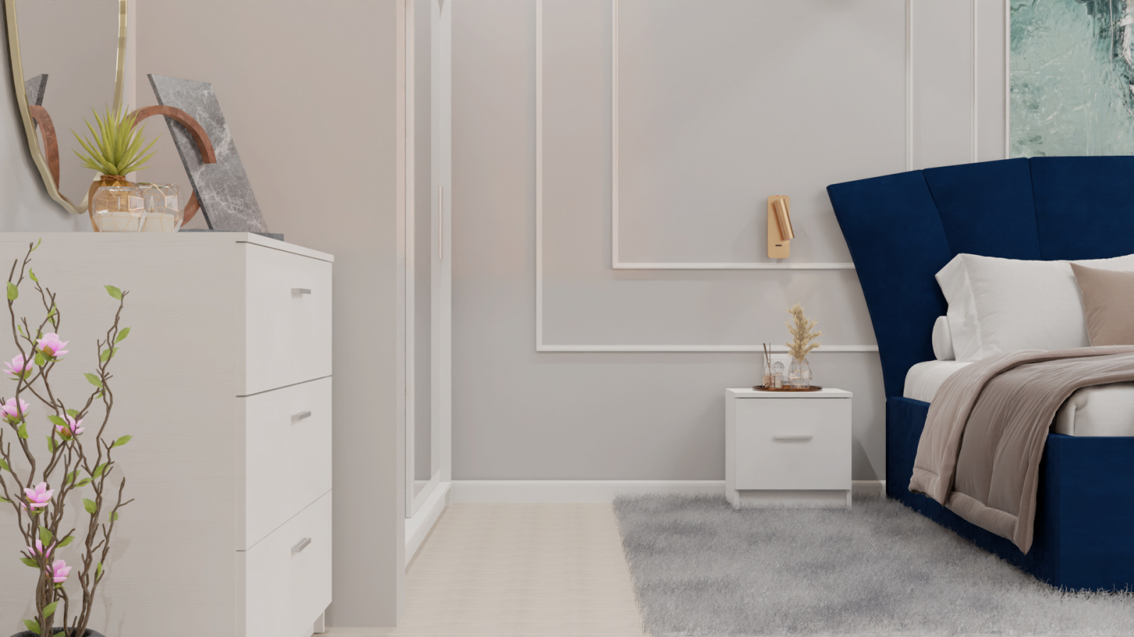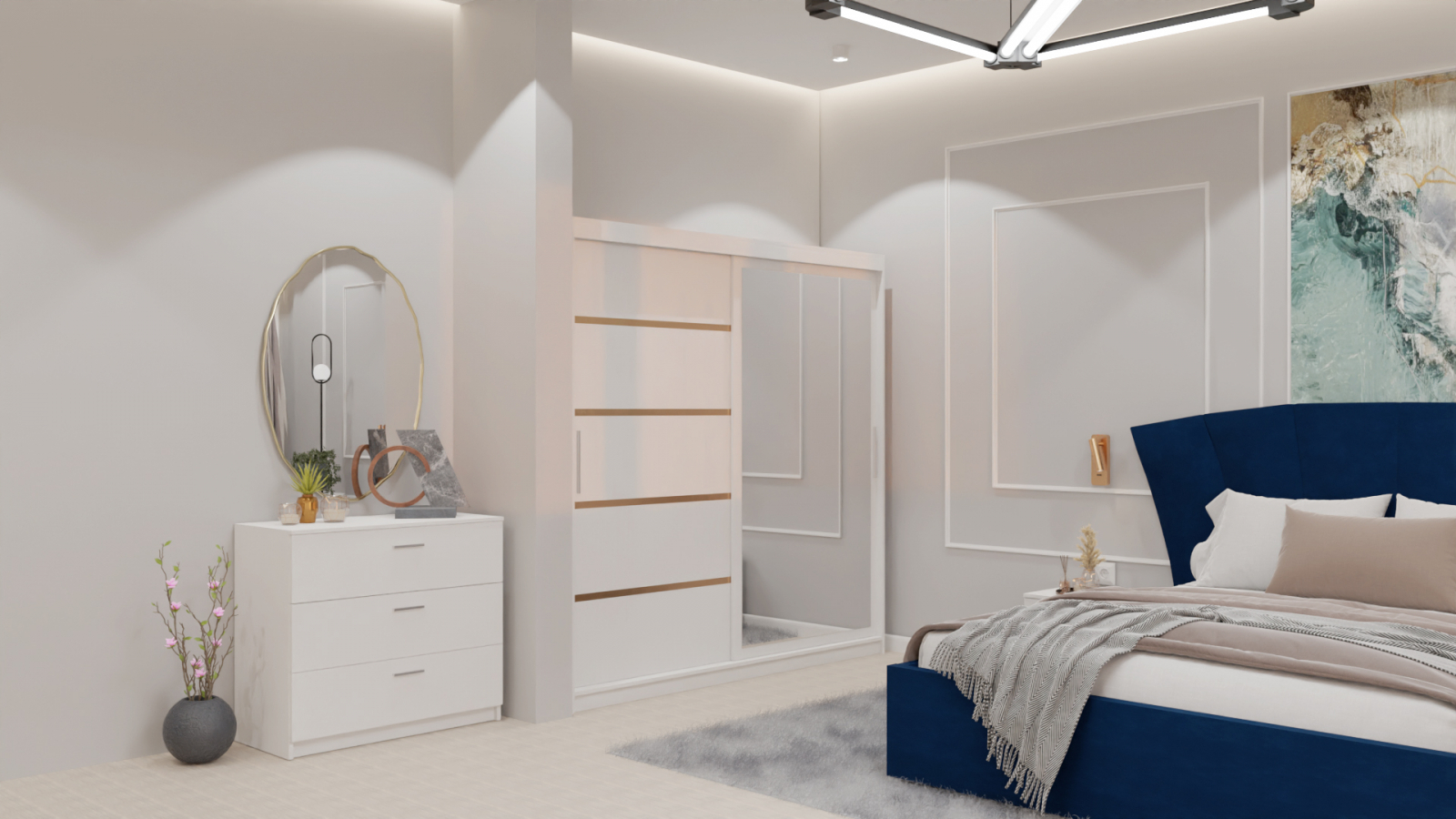 Dormitor Lucas cu Pat Tapitat Stofa Albastru cu dulap 200*200 usi glisante Alb , noptiere si comoda