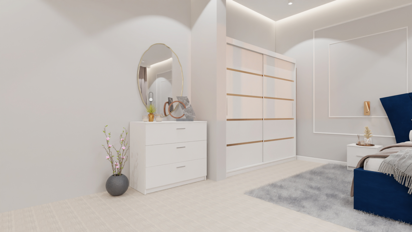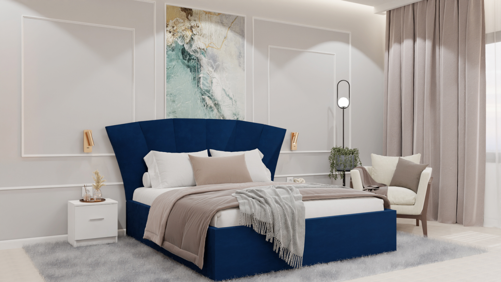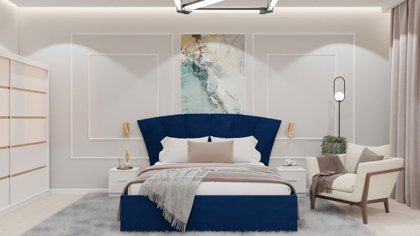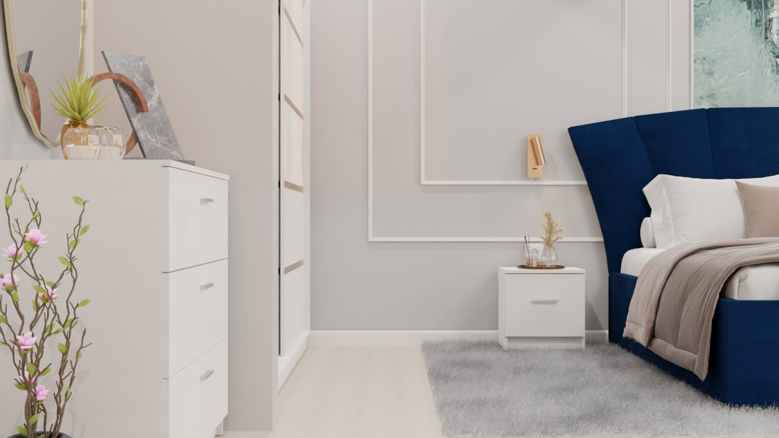 Dormitor Lucas cu Pat Tapitat Stofa Albastru cu dulap 200*200 usi glisante Alb , noptiere si comoda