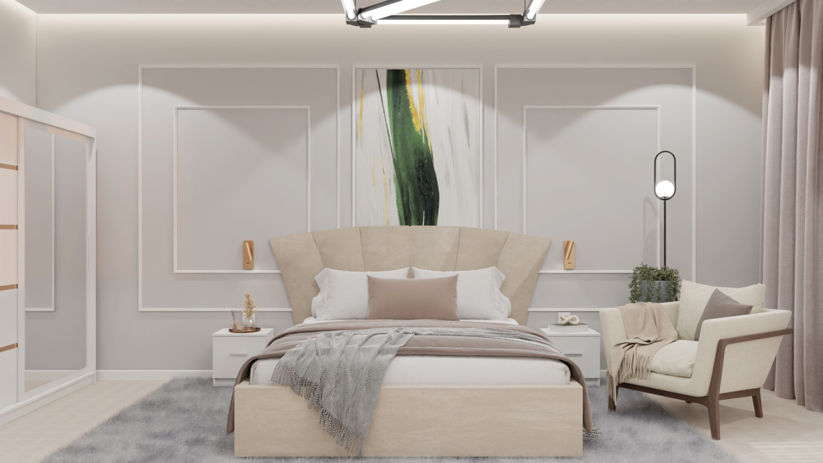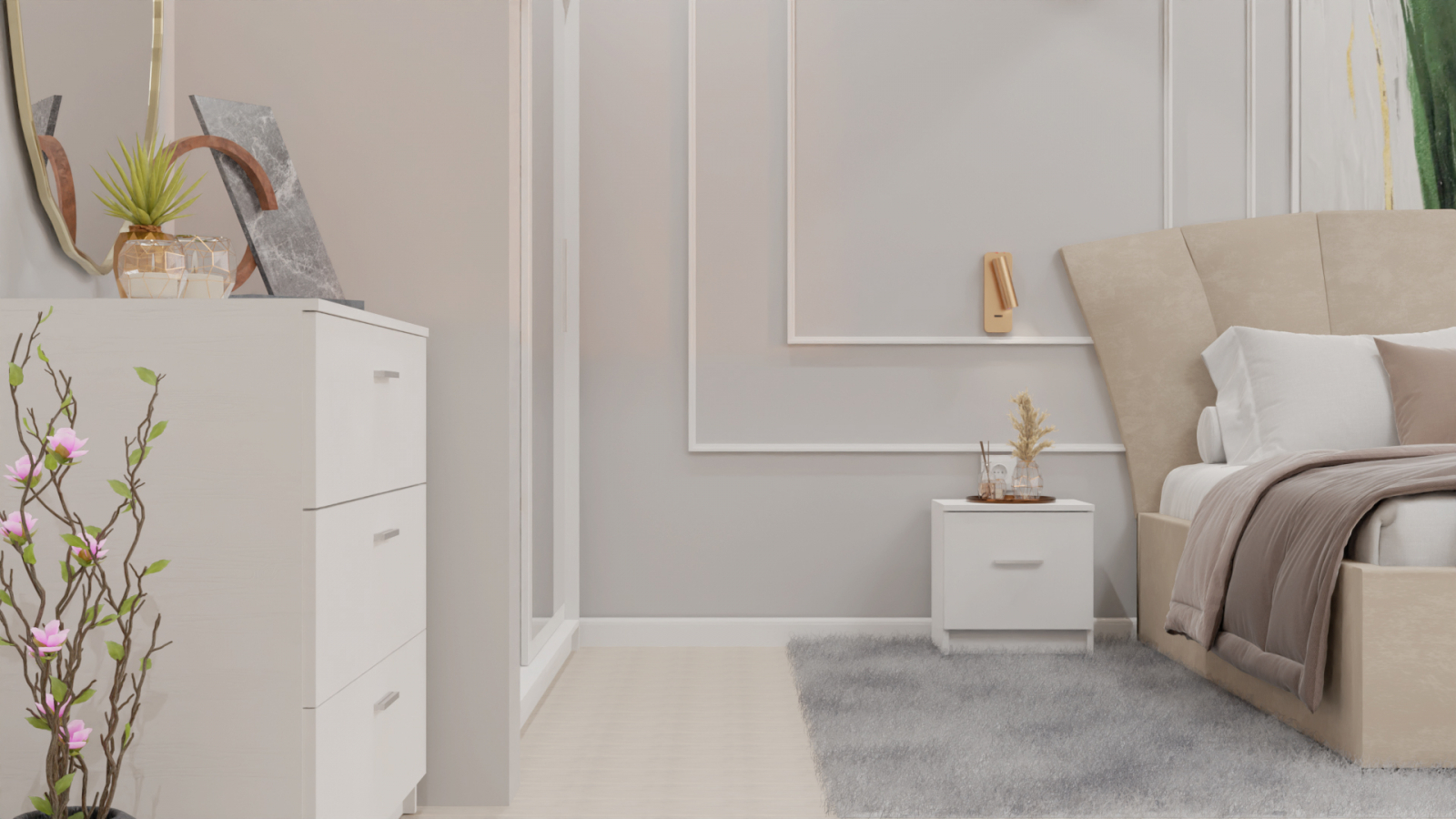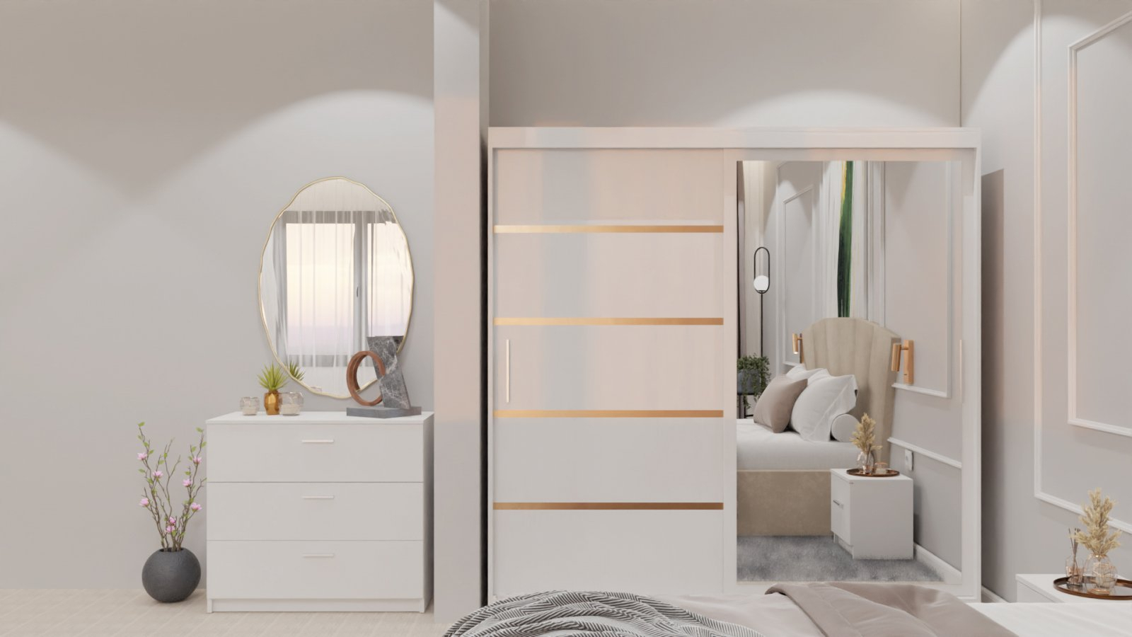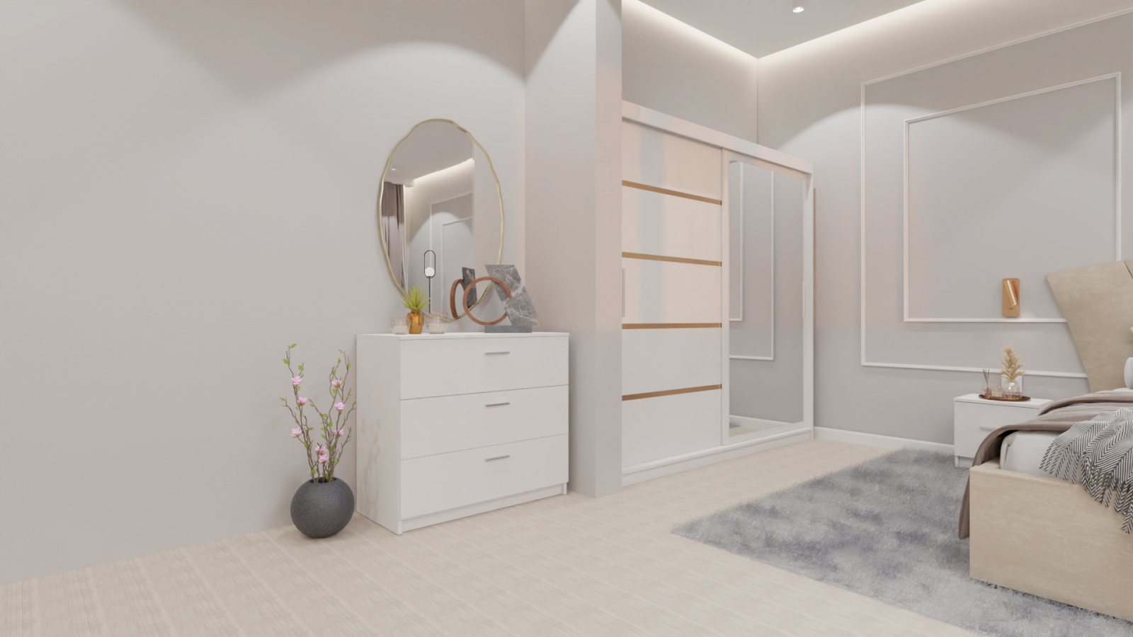 Dormitor Lucas cu Pat Tapitat Stofa Bej cu dulap 200*200 usi glisante Alb cu oglinda , noptiere si comoda