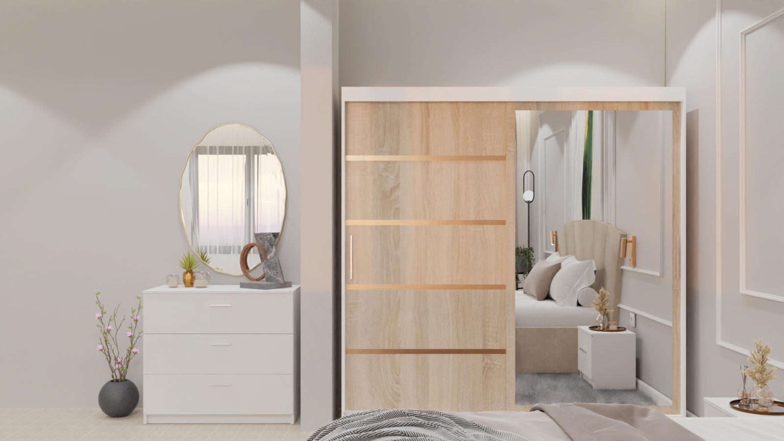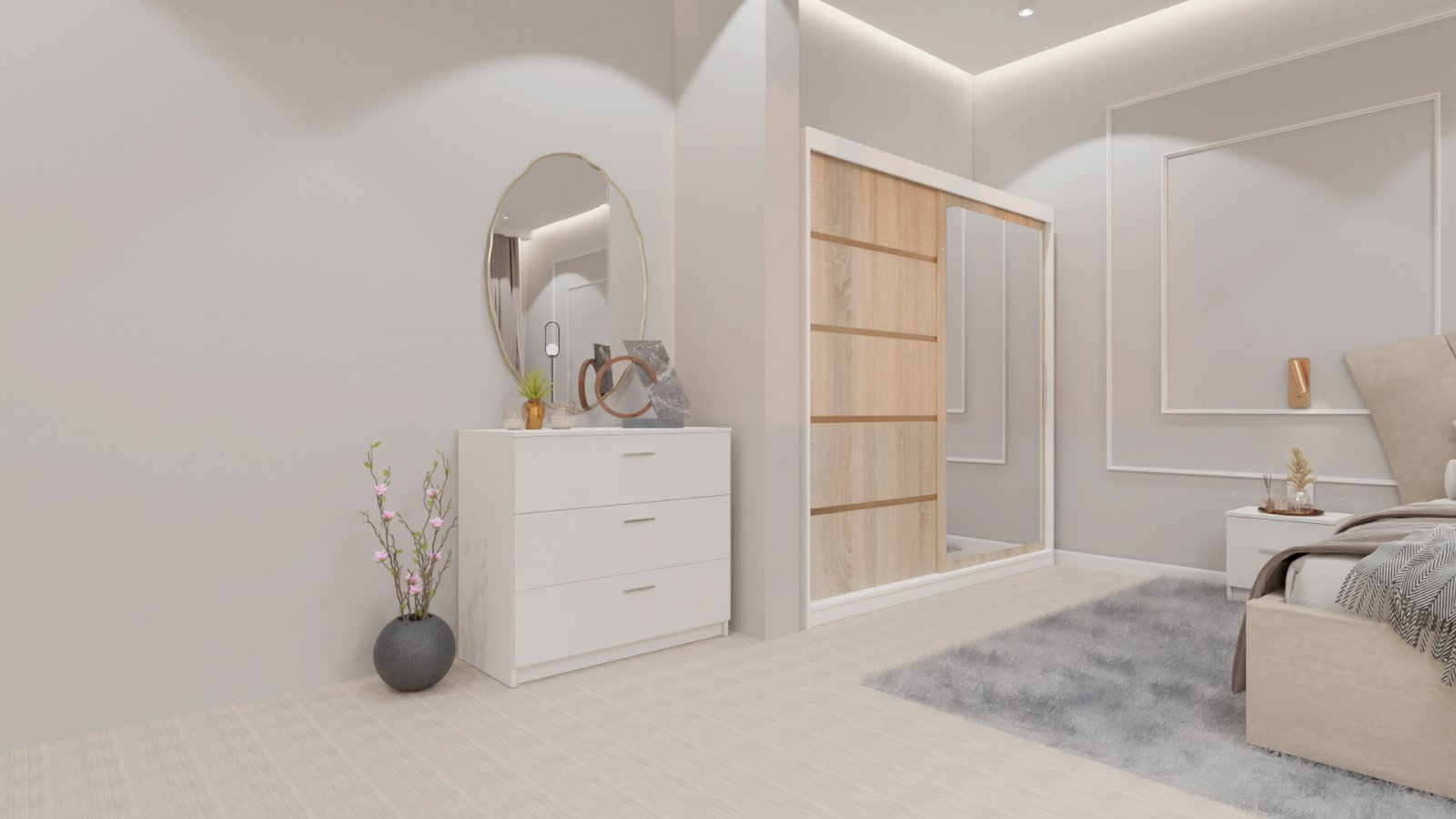 Dormitor Lucas cu Pat Tapitat Stofa Bej cu dulap 200*200 usi glisante Sonoma&Alb cu oglinda , noptiere si comoda