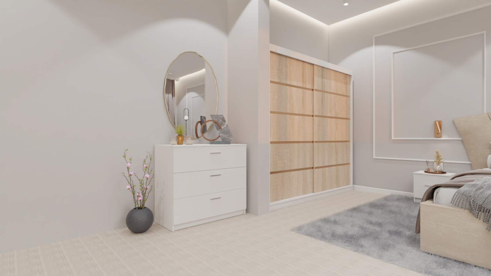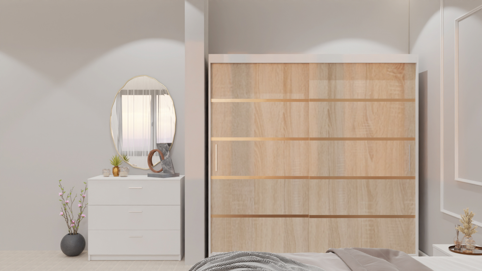 Dormitor Lucas cu Pat Tapitat Stofa Bej cu dulap 200*200 usi glisante Sonoma&Alb , noptiere si comoda