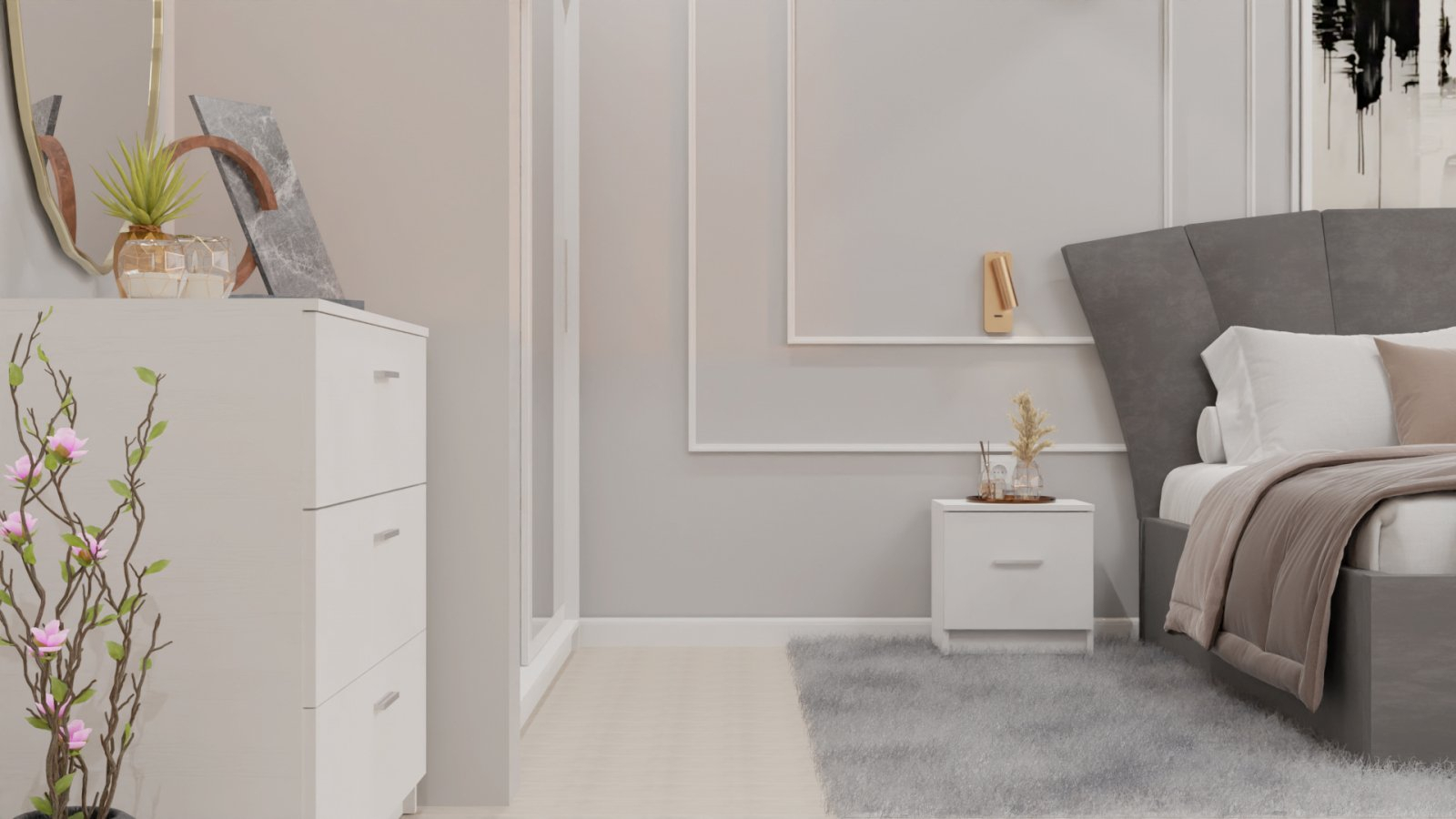 Dormitor Lucas cu Pat Tapitat Stofa Gri cu dulap 200*200 usi glisante Alb cu oglinda , noptiere si comoda