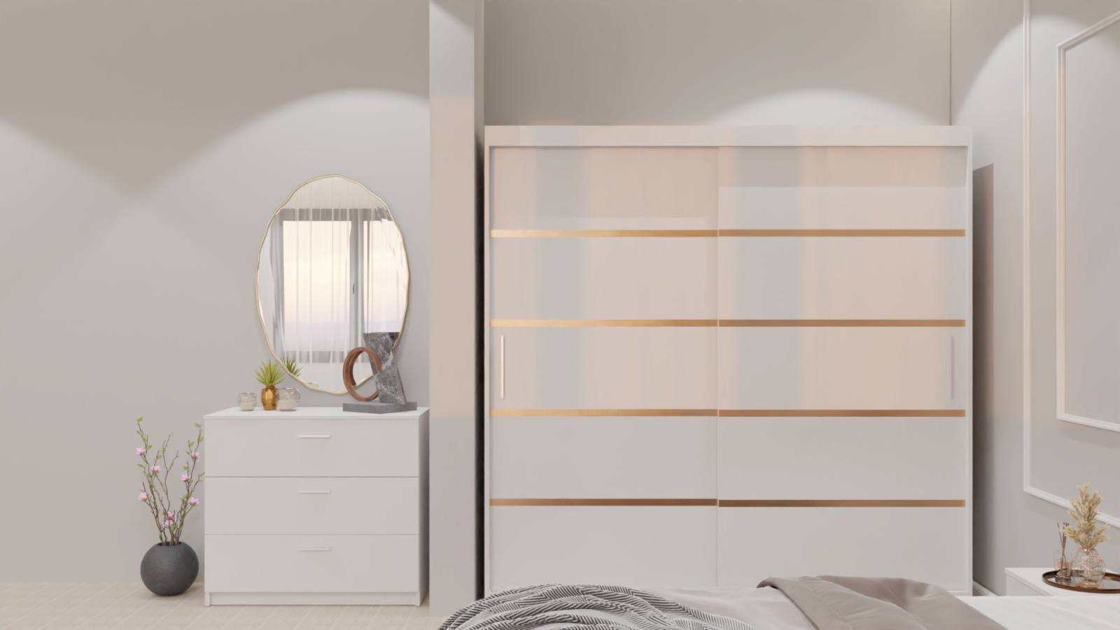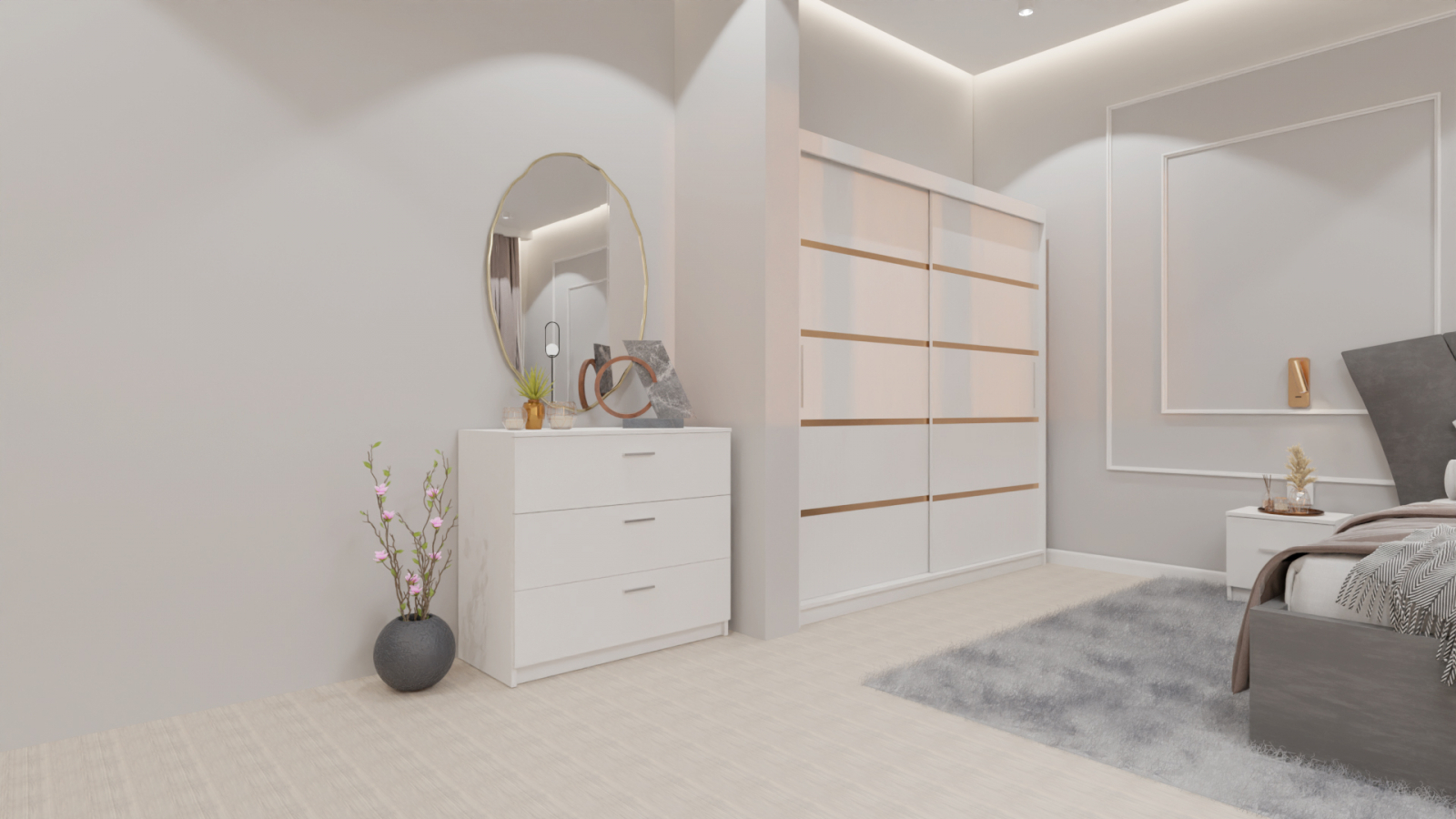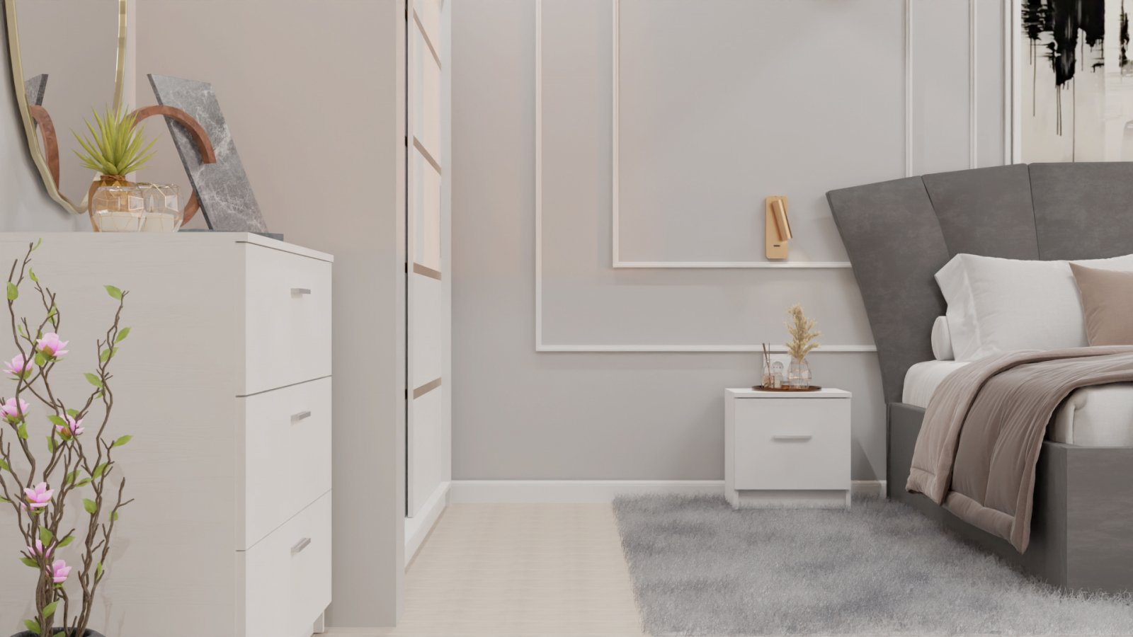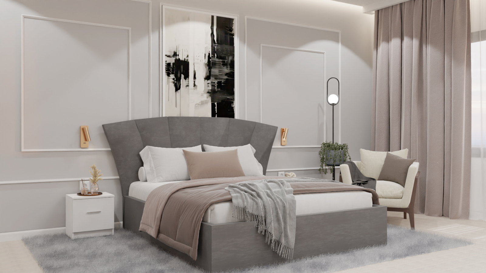Dormitor Lucas cu Pat Tapitat Stofa Gri cu dulap 200*200 usi glisante Alb , noptiere si comoda