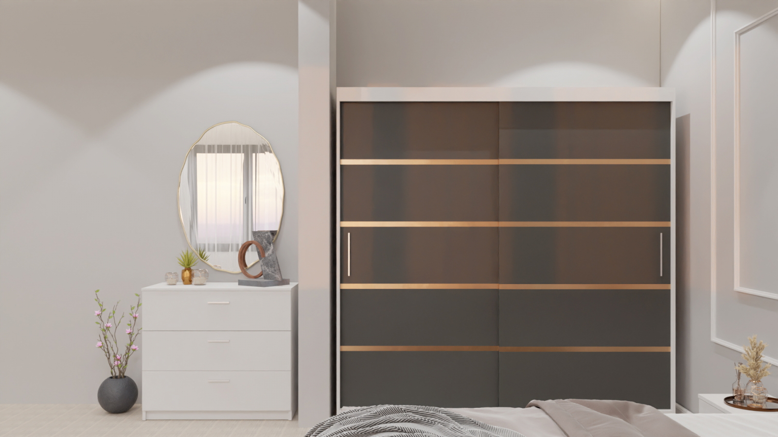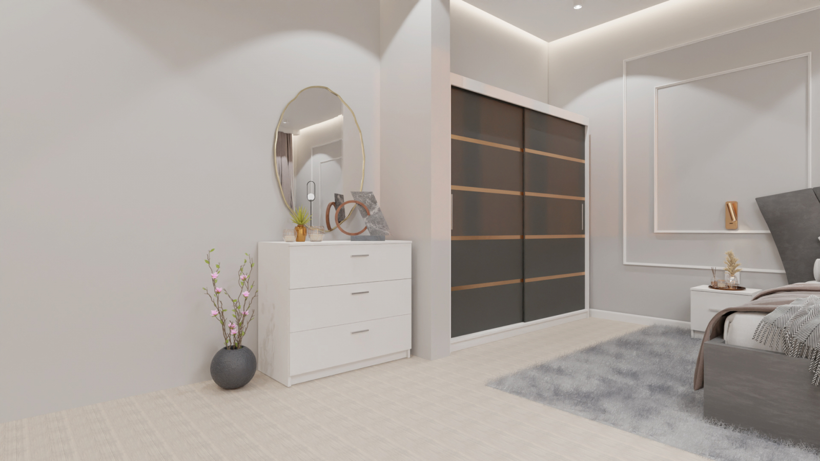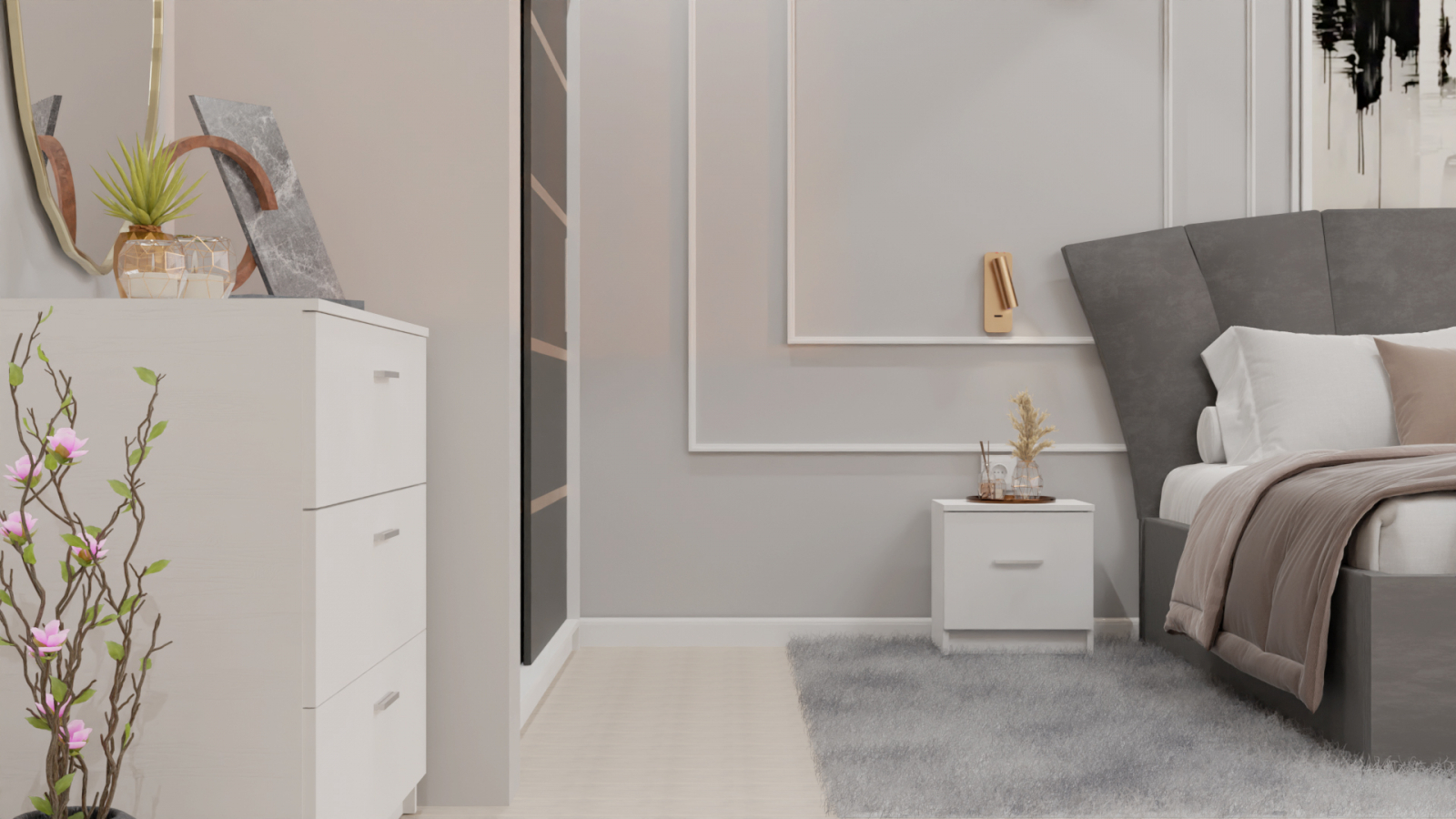 Dormitor Lucas cu Pat Tapitat Stofa Gri cu dulap 200*200 usi glisante Antracit&Alb , noptiere si comoda