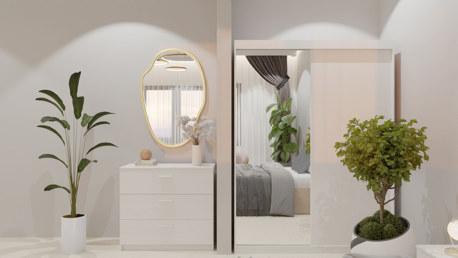 Dormitor Lucas Tapitat Bej 2 Usi Alb cu Oglinda
