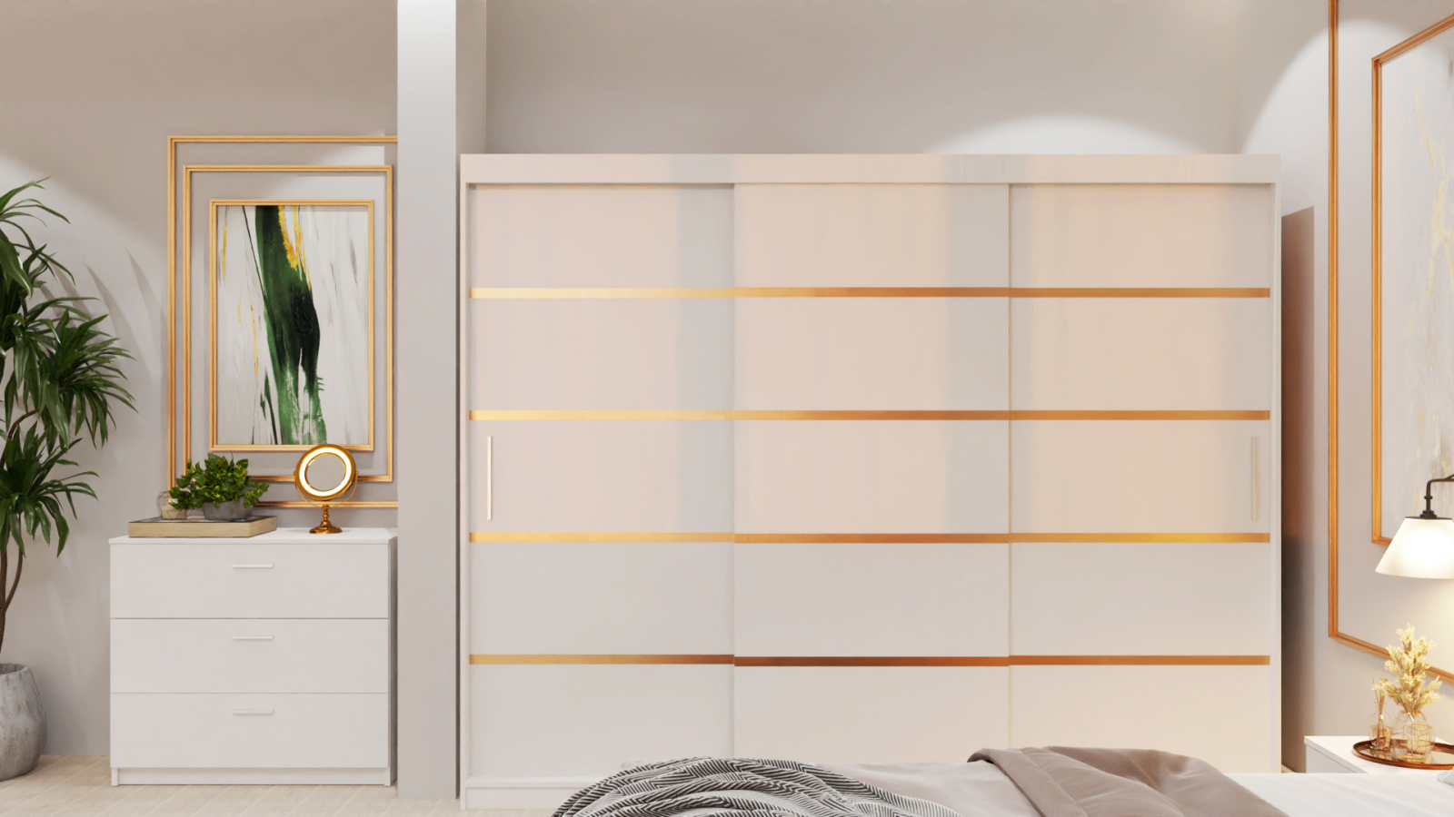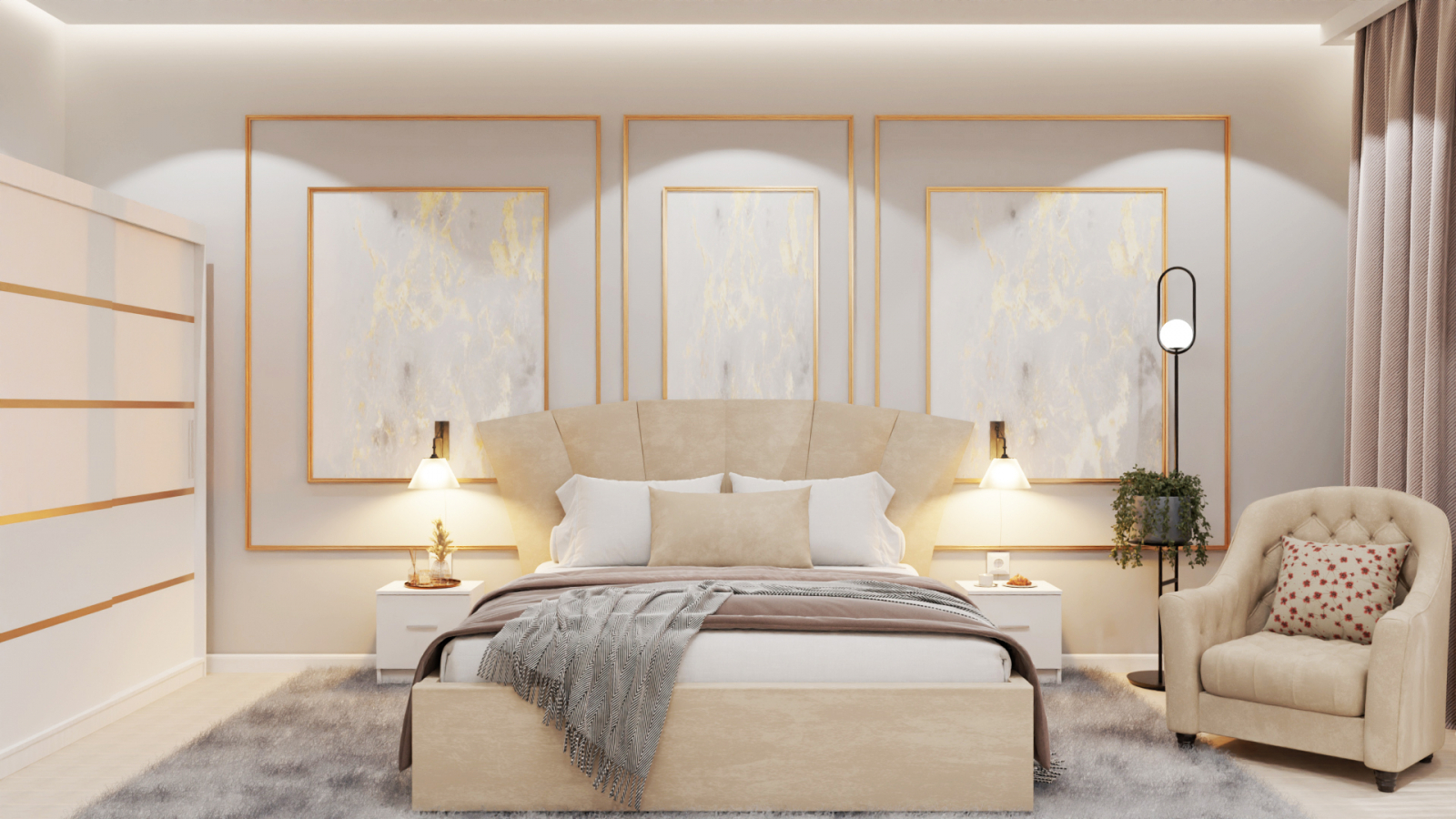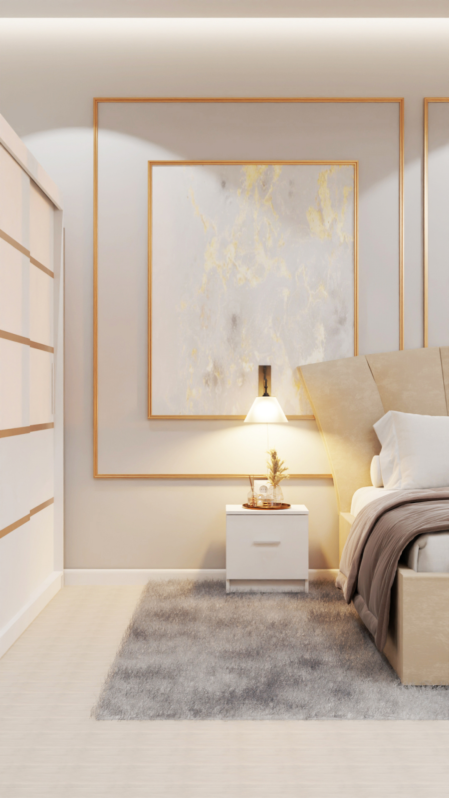 Dormitor Lucas Tapitat Stofa Bej cu dulap 250*200 usi glisante Alb, noptiere si comoda