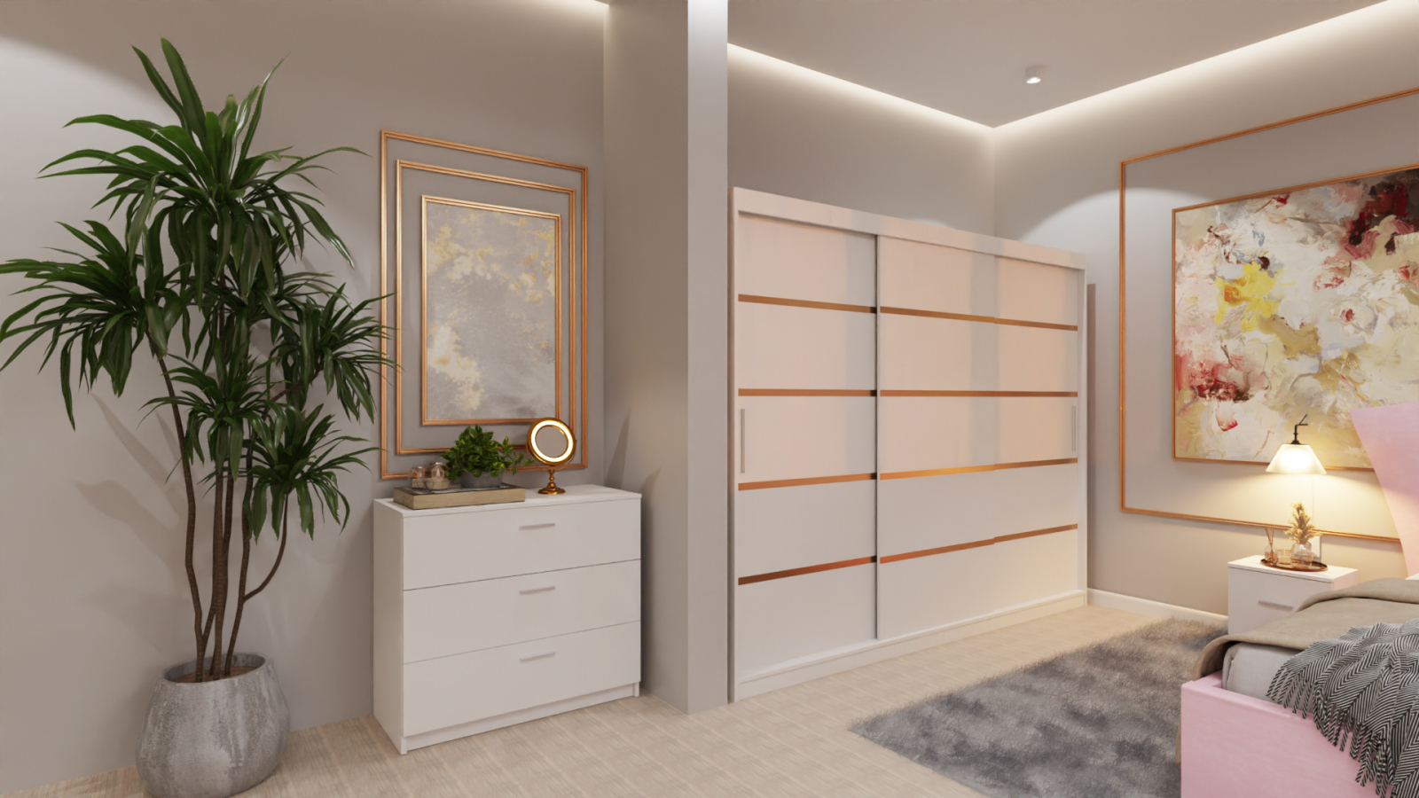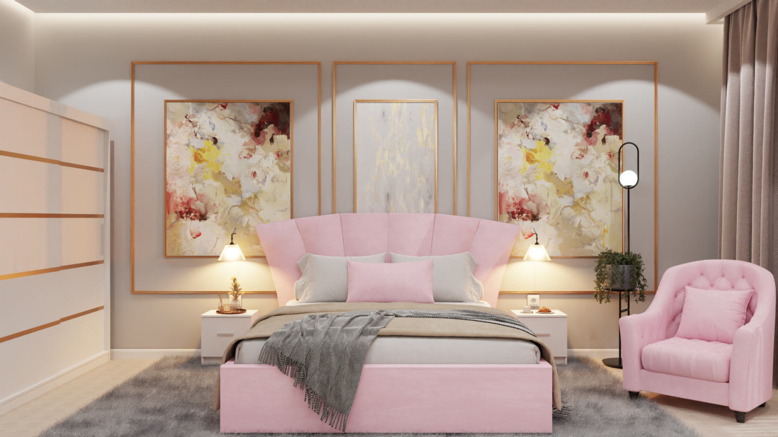 Dormitor Lucas Tapitat Stofa Roz cu dulap 250*200 usi glisante Alb, noptiere si comoda