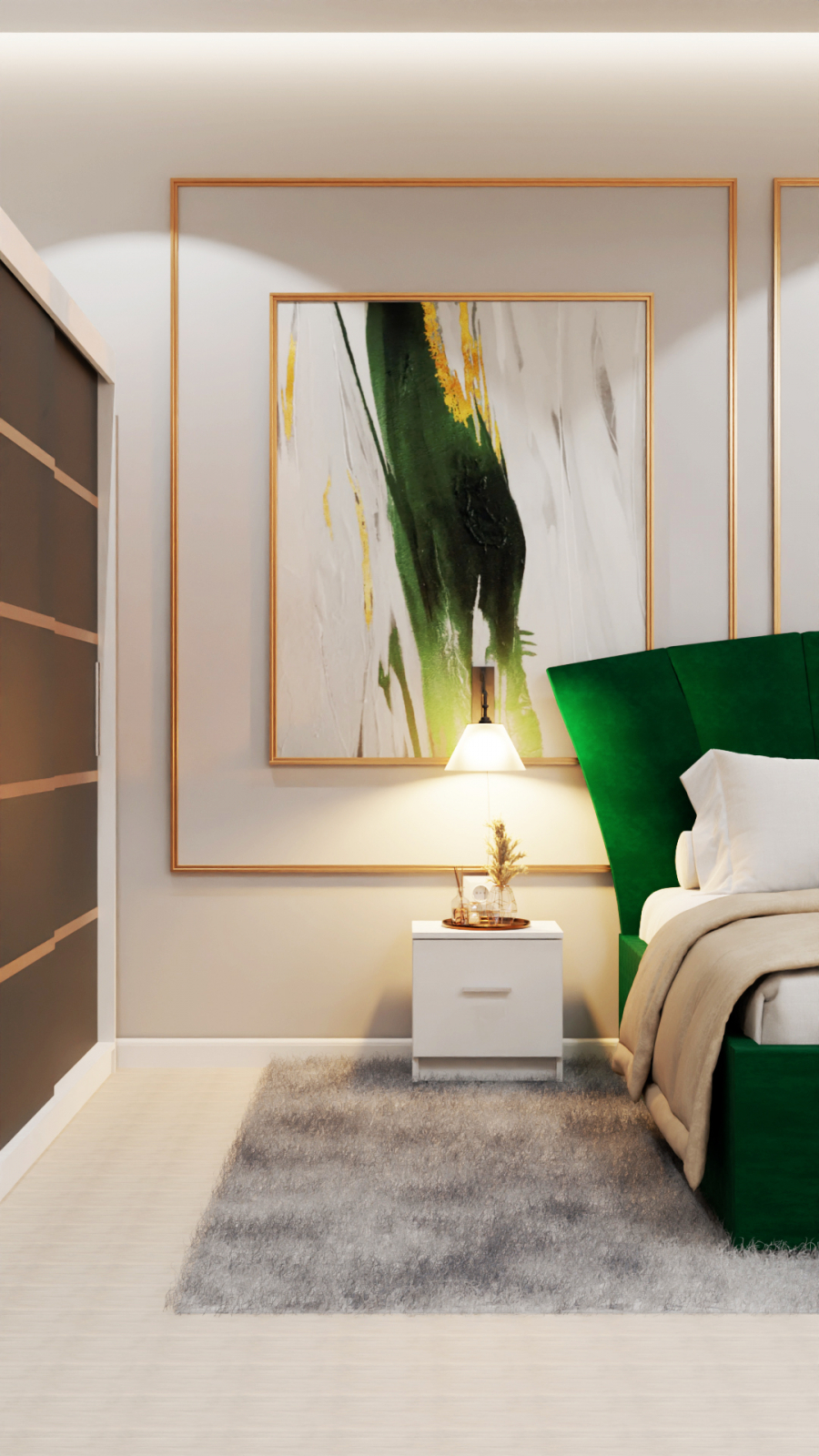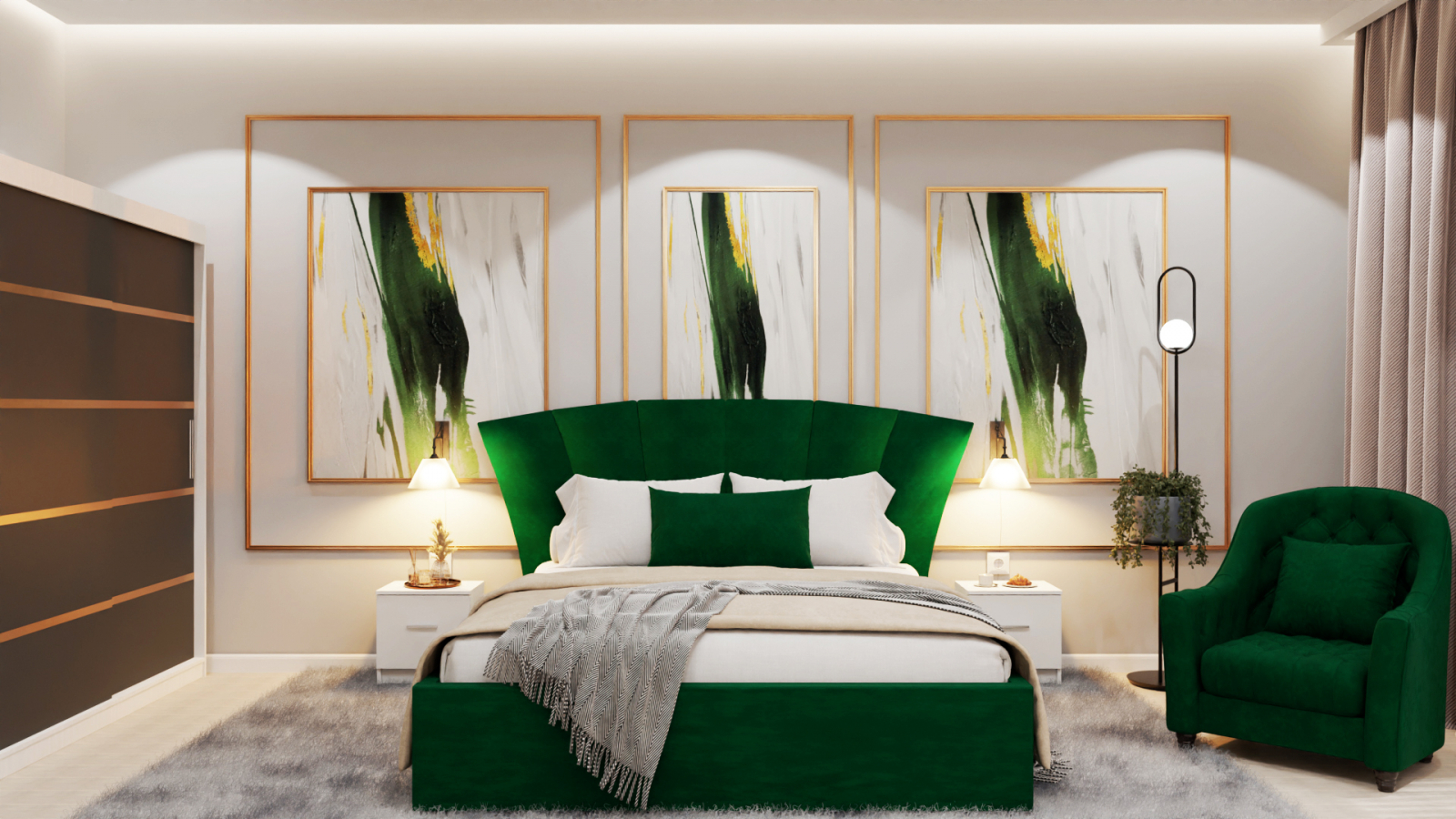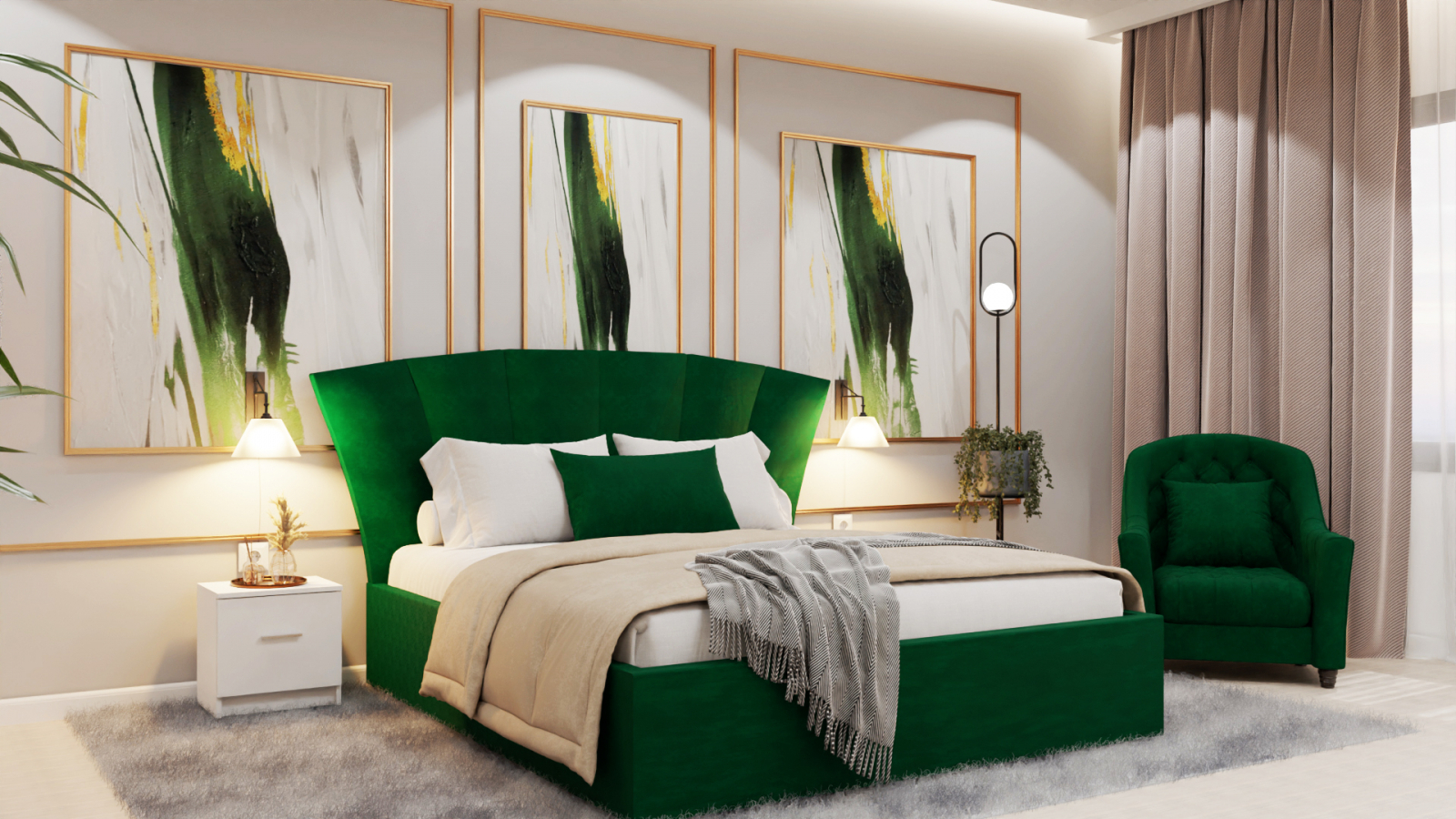 Dormitor Lucas Tapitat Stofa Verde cu dulap 250*200 usi glisante Alb&Antracit, noptiere si comoda