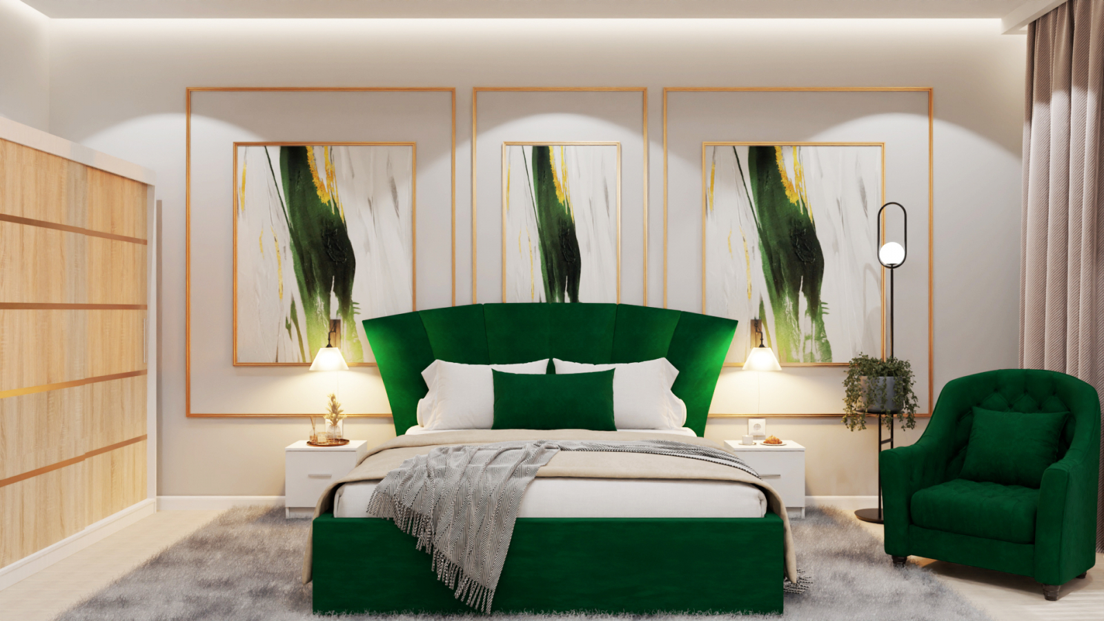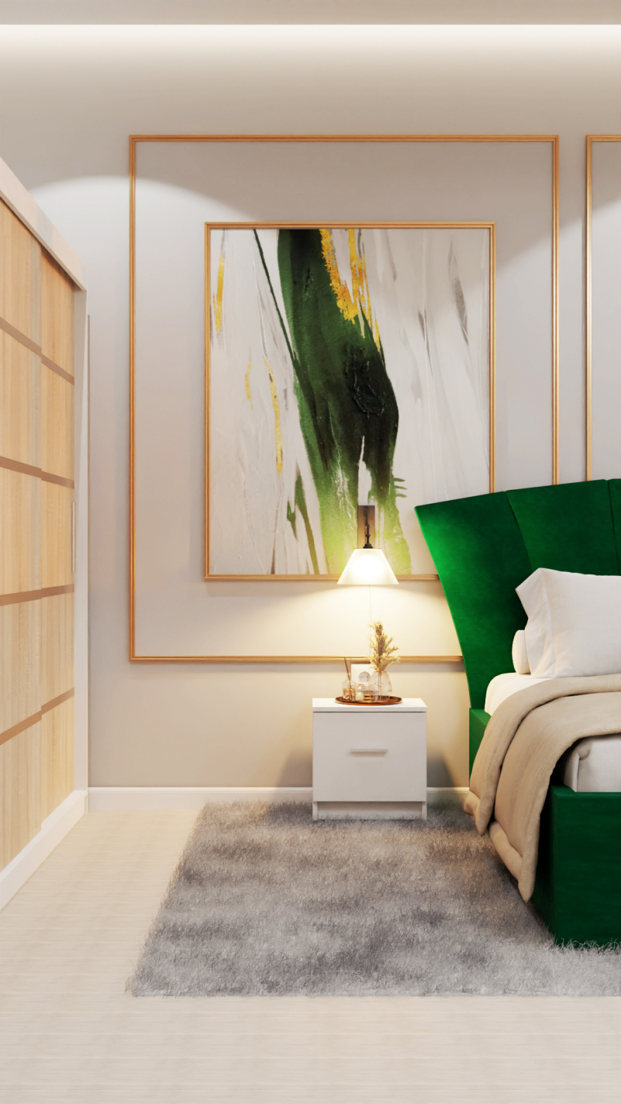 Dormitor Lucas Tapitat Stofa Verde cu dulap 250*200 usi glisante Alb&Sonoma, noptiere si comoda