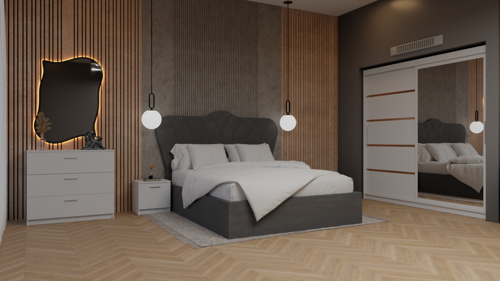 Dormitor Queen cu Pat Tapitat cu dressing 200*200 usi glisante Alb cu Oglinda , noptiere si comoda