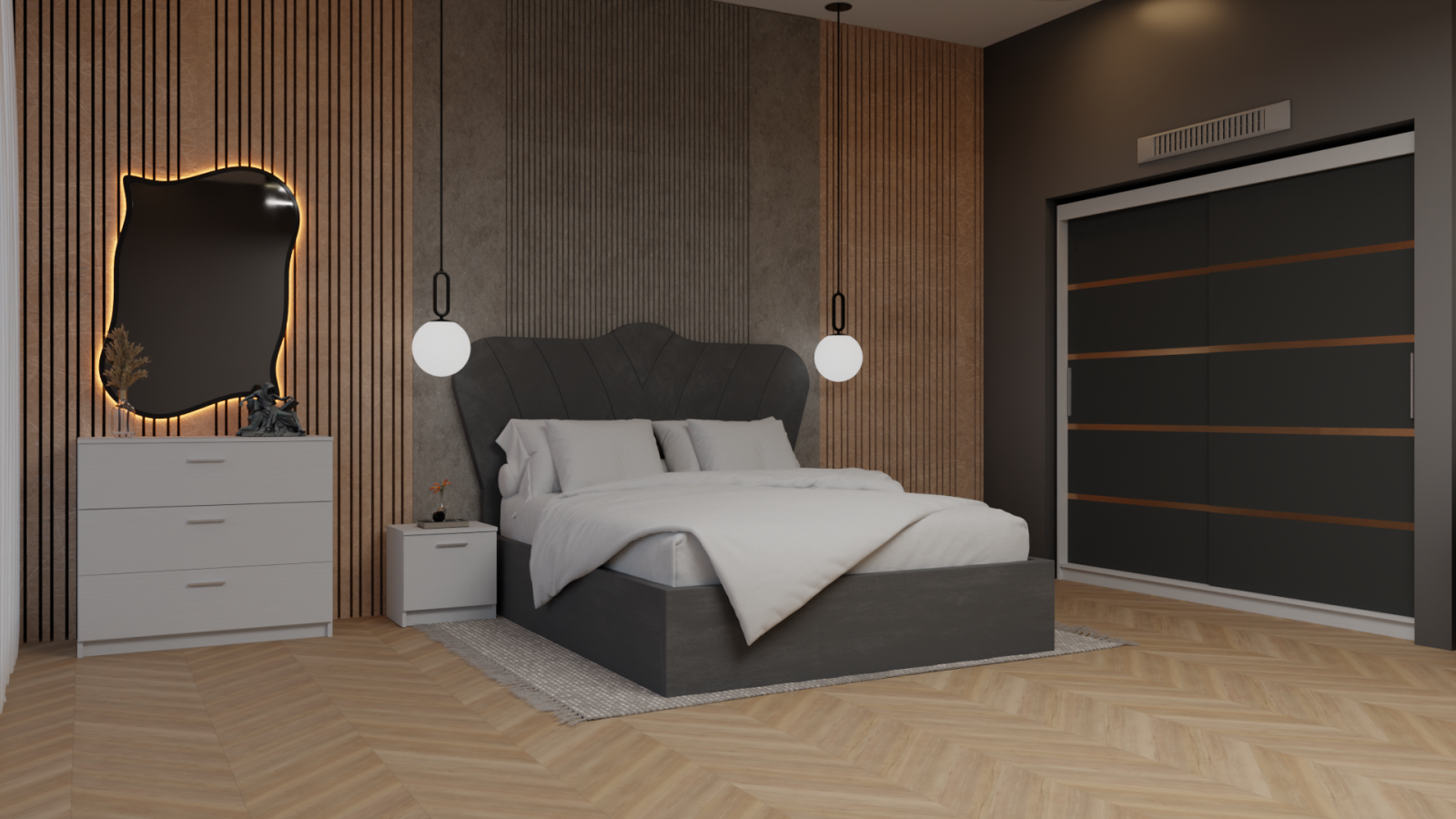 Dormitor Queen cu Pat Tapitat cu dressing 200*200 usi glisante Alb&Gri Antracit, noptiere si comoda