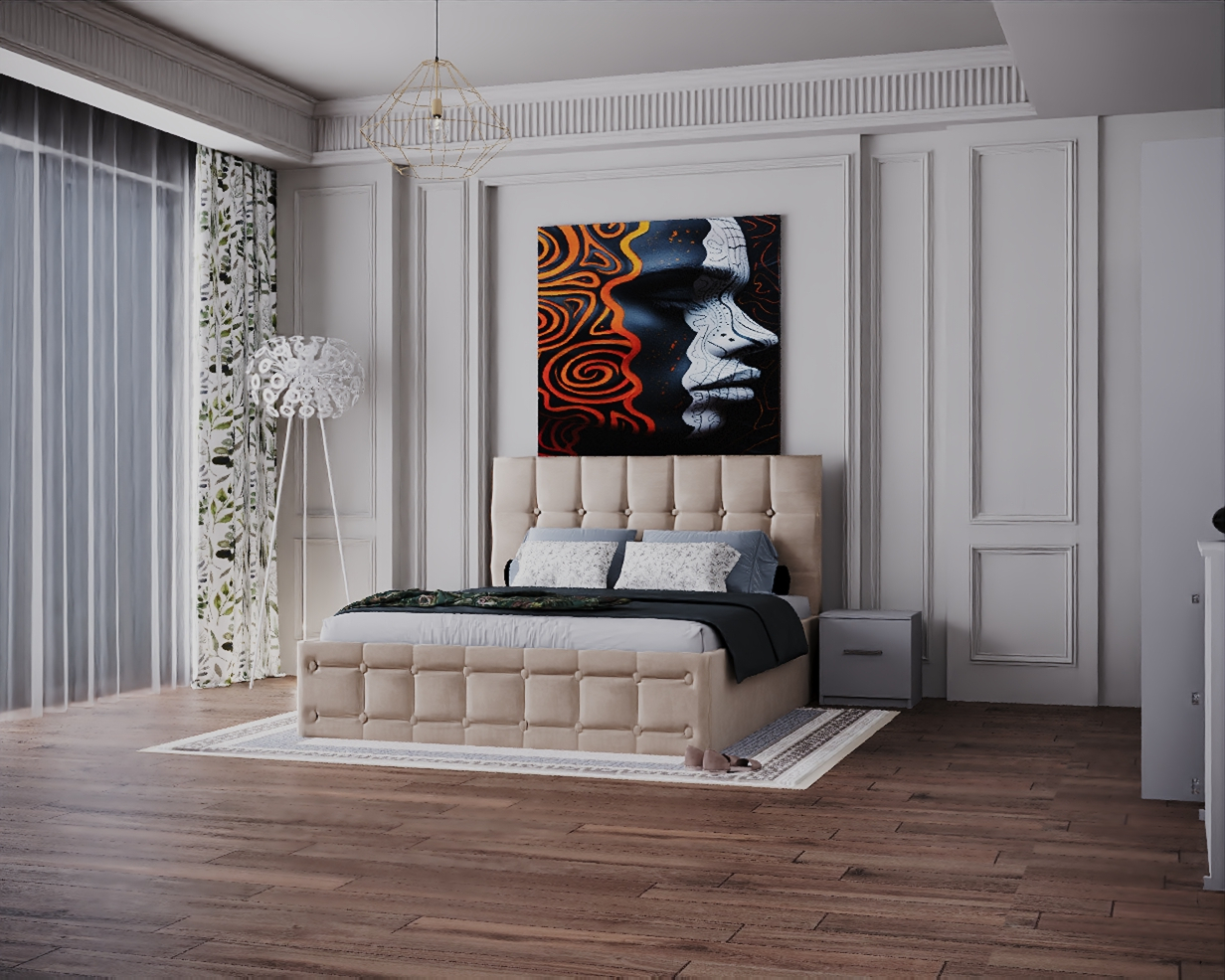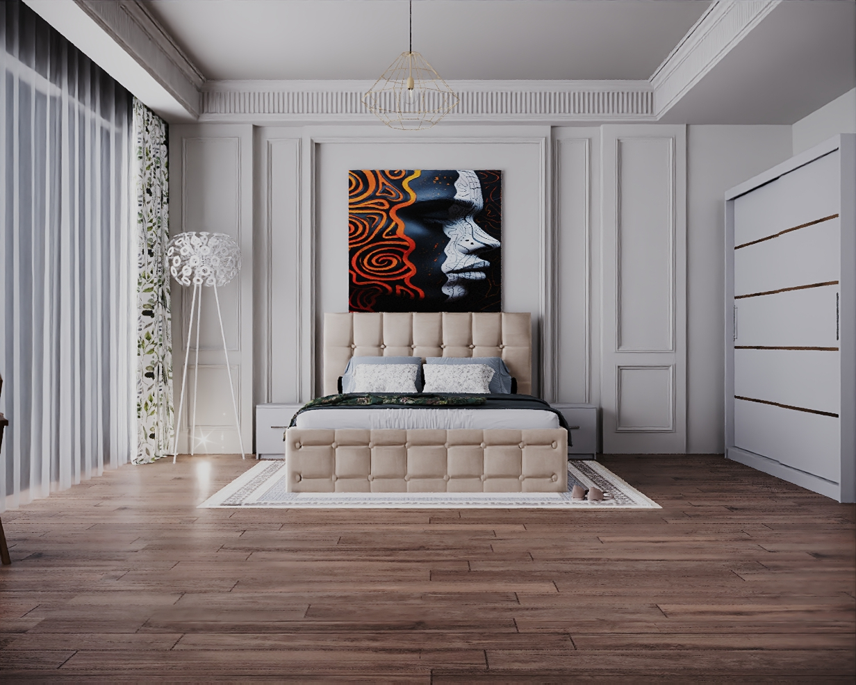 Dormitor Regal cu Pat Tapitat Stofa Bej cu dulap 200*200 usi glisante Alb, noptiere si comoda