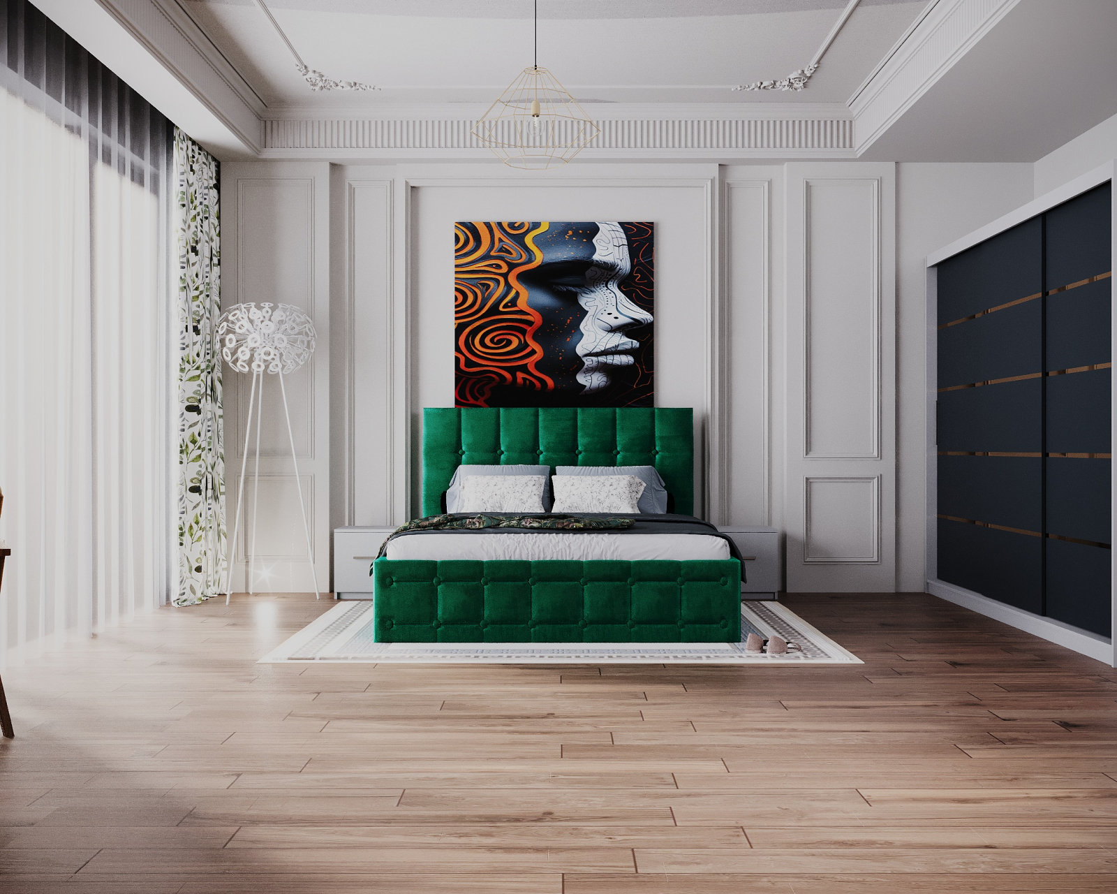 Dormitor Regal cu Pat Tapitat Stofa Verde cu dulap 250*200 usi glisante Alb&Antracit, noptiere si comoda