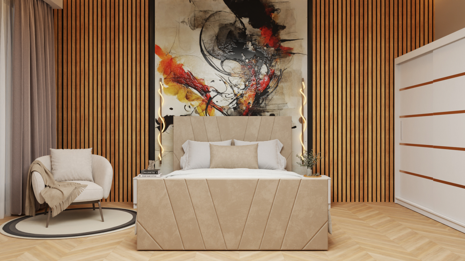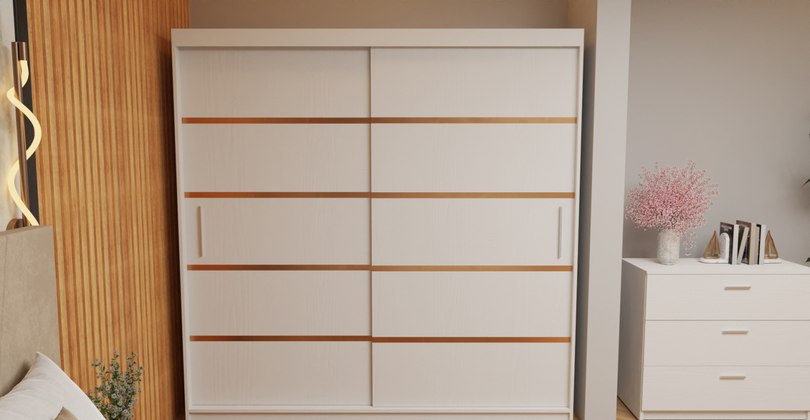 Dormitor Tony Tapitat Stofa Bej cu dulap 200*200 usi glisante Alb, noptiere si comoda