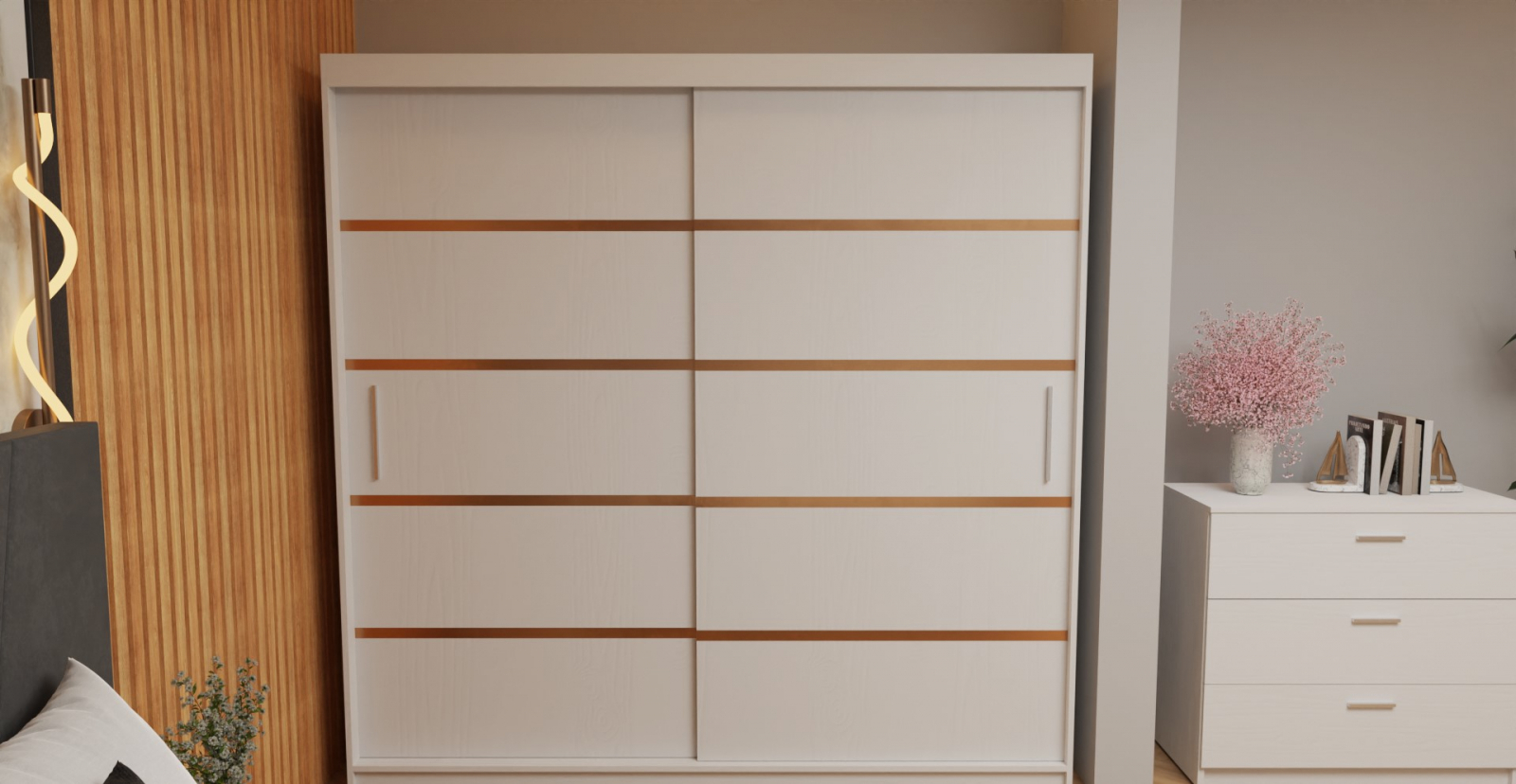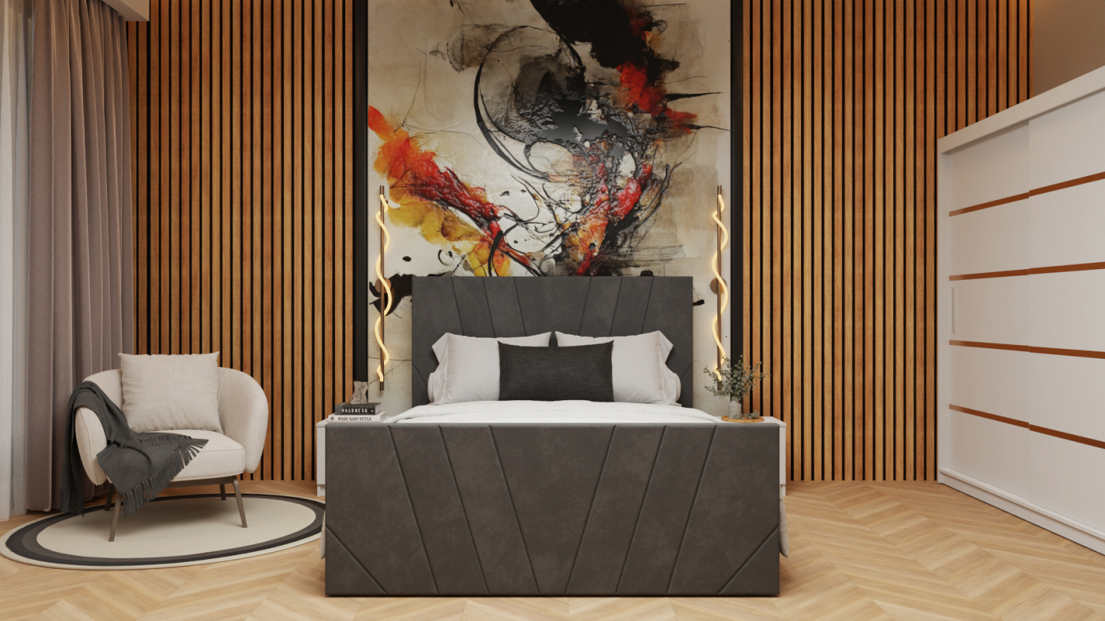 Dormitor Tony Tapitat Stofa Gri cu dulap 200*200 usi glisante Alb, noptiere si comoda