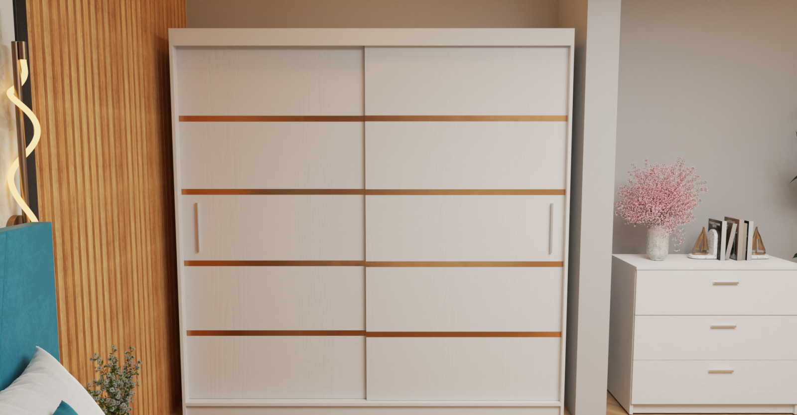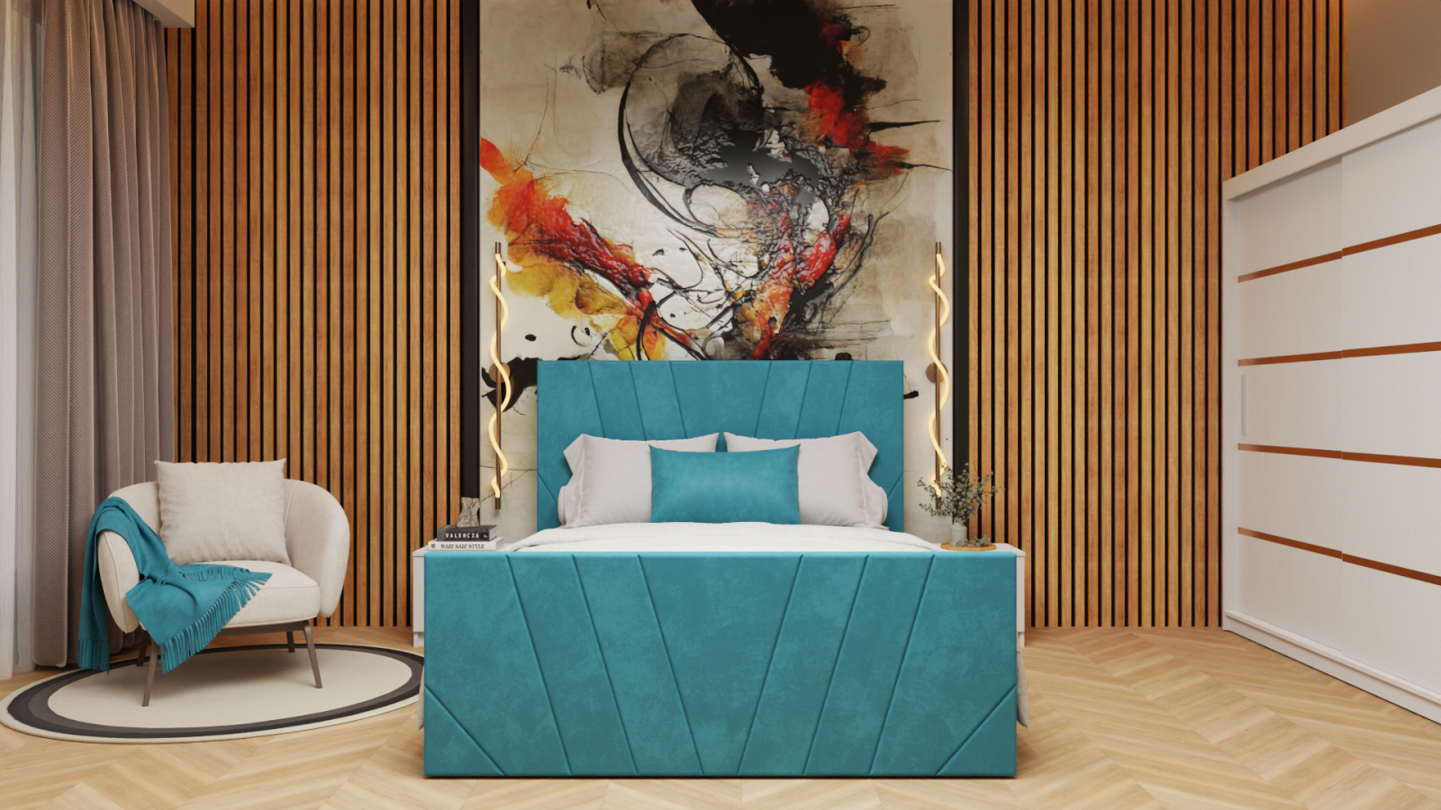 Dormitor Tony Tapitat Stofa Turcoaz cu dulap 200*200 usi glisante Alb, noptiere si comoda