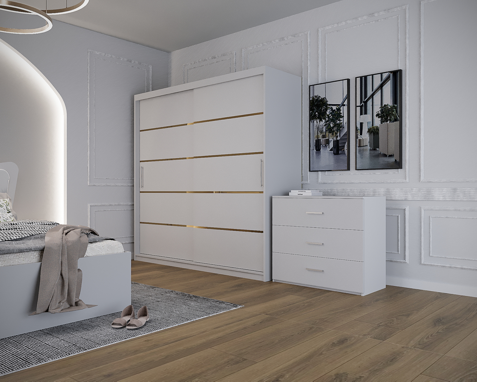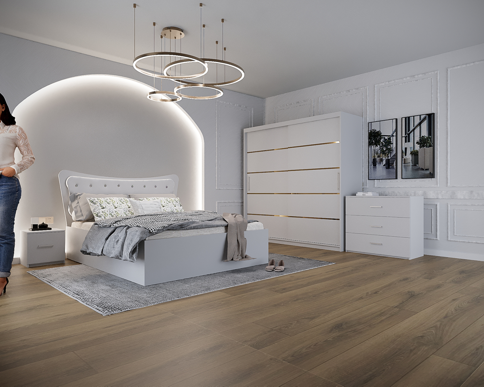 Dormitor Vista cu Pat Tapitat Alb cu dulap 200*200 usi glisante Alb, noptiere si comoda