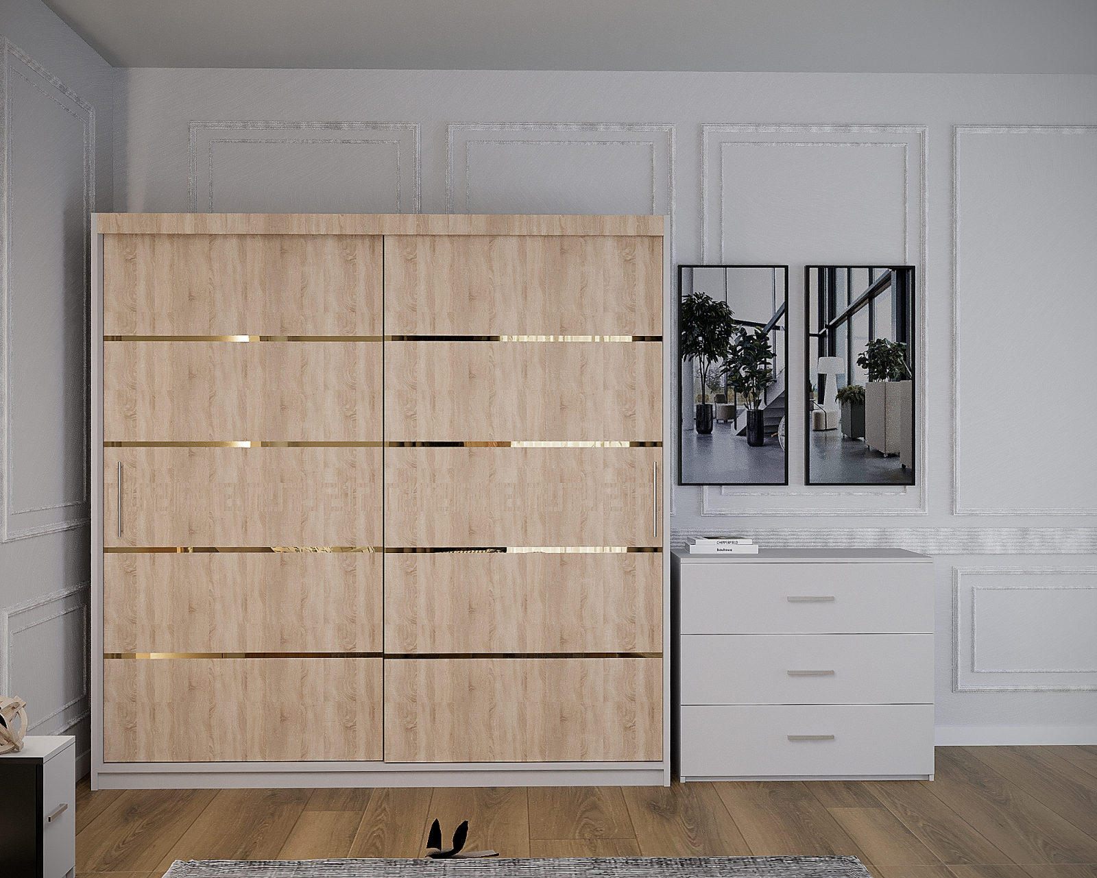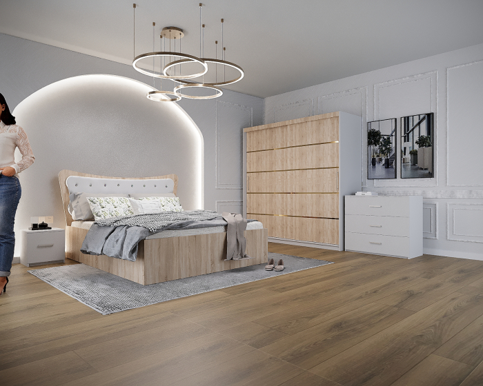 Dormitor Vista cu Pat Tapitat Sonoma&Alb cu dulap 200*200 usi glisante Sonoma&Alb, noptiere si comoda