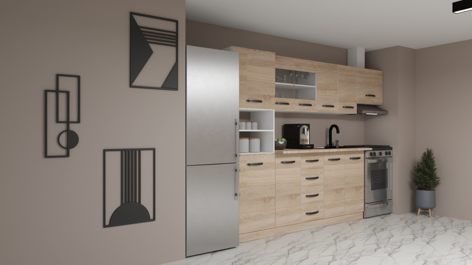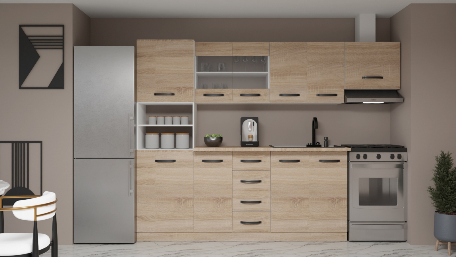 Daca spatiul tau se rezuma la 280cm si esti un iubitor al culorii Sonoma&Alb, noi iti recomandam mobila de bucatarie Karina!