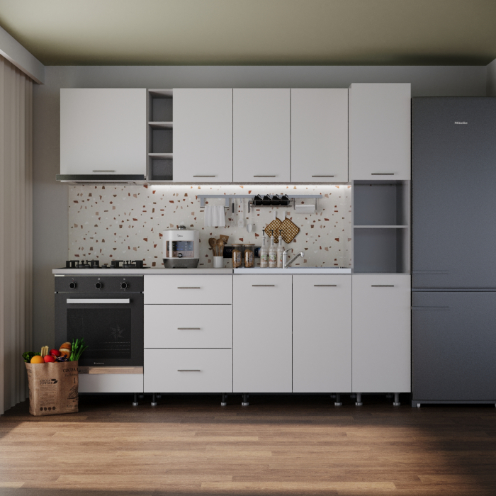 Daca spatiul tau se rezuma la 240cm si esti un iubitor al culorii Alb, noi iti recomandam mobila de bucatarie Sena!