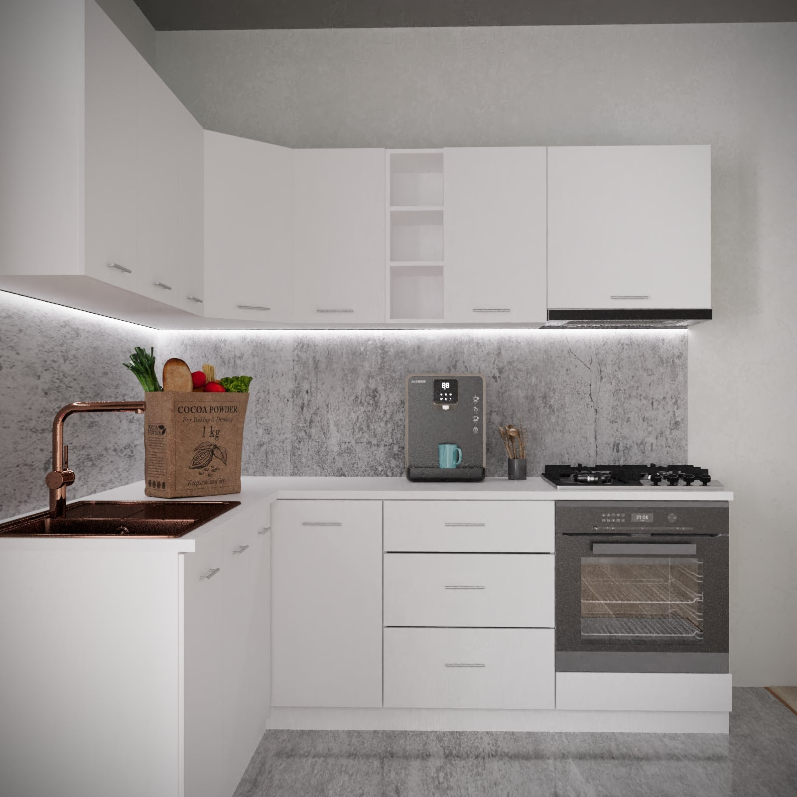 Daca spatiul tau se rezuma la 180 x 220 cm si esti un iubitor al culorii Alb, noi iti recomandam mobila de bucatarie Sena Colt !